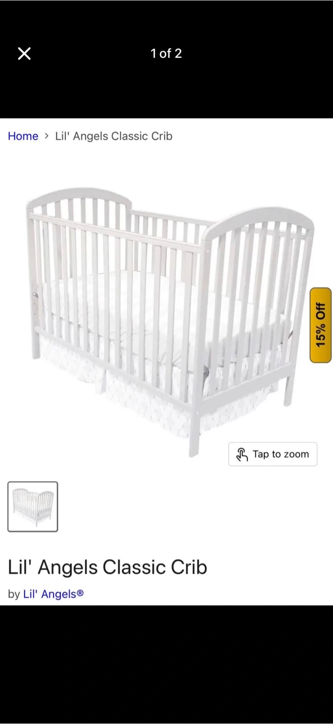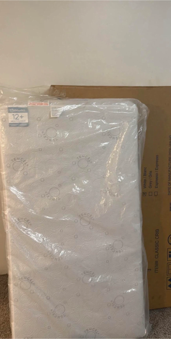 This crib mattress is for ages 12 months and up. It's made with Tencel material and comes in white. A crib is also shown in the listing. Selling with crib and mattress
