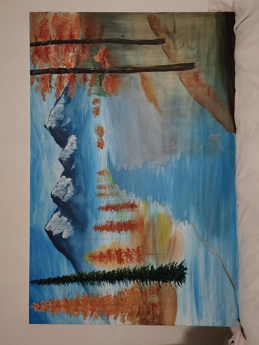 This is an acrylic painting featuring an abstract landscape. It depicts a profile of a face integrated with mountainous terrain and trees with autumn foliage. The artwork uses a cool blue palette contrasted with warm oranges and yellows.