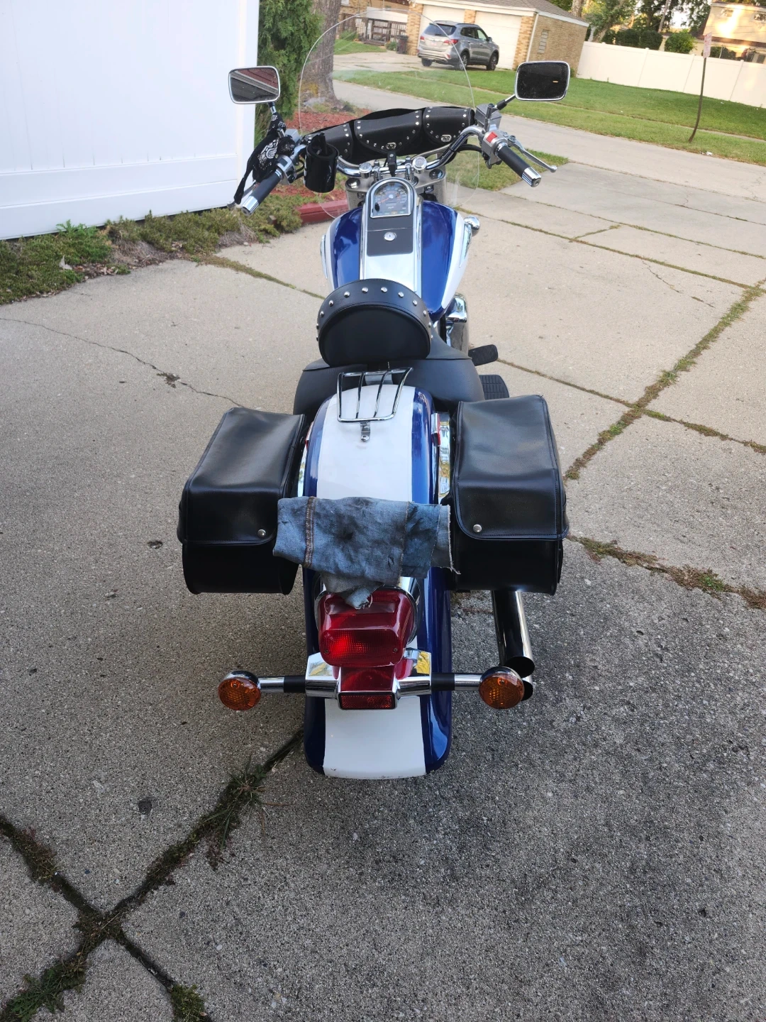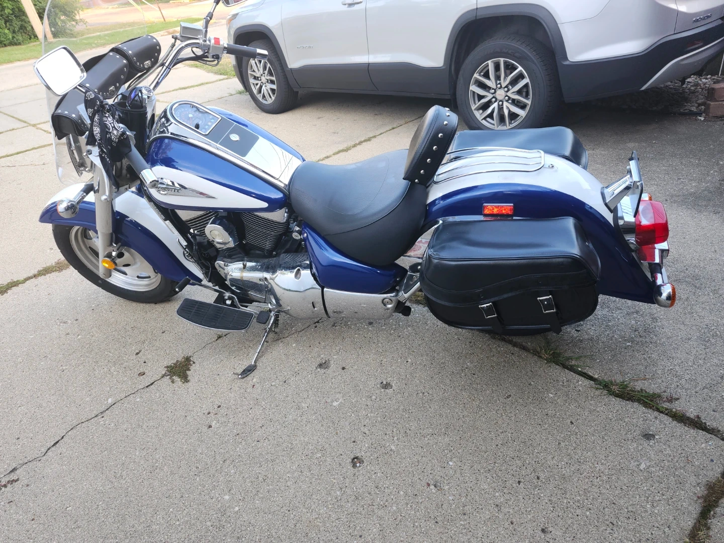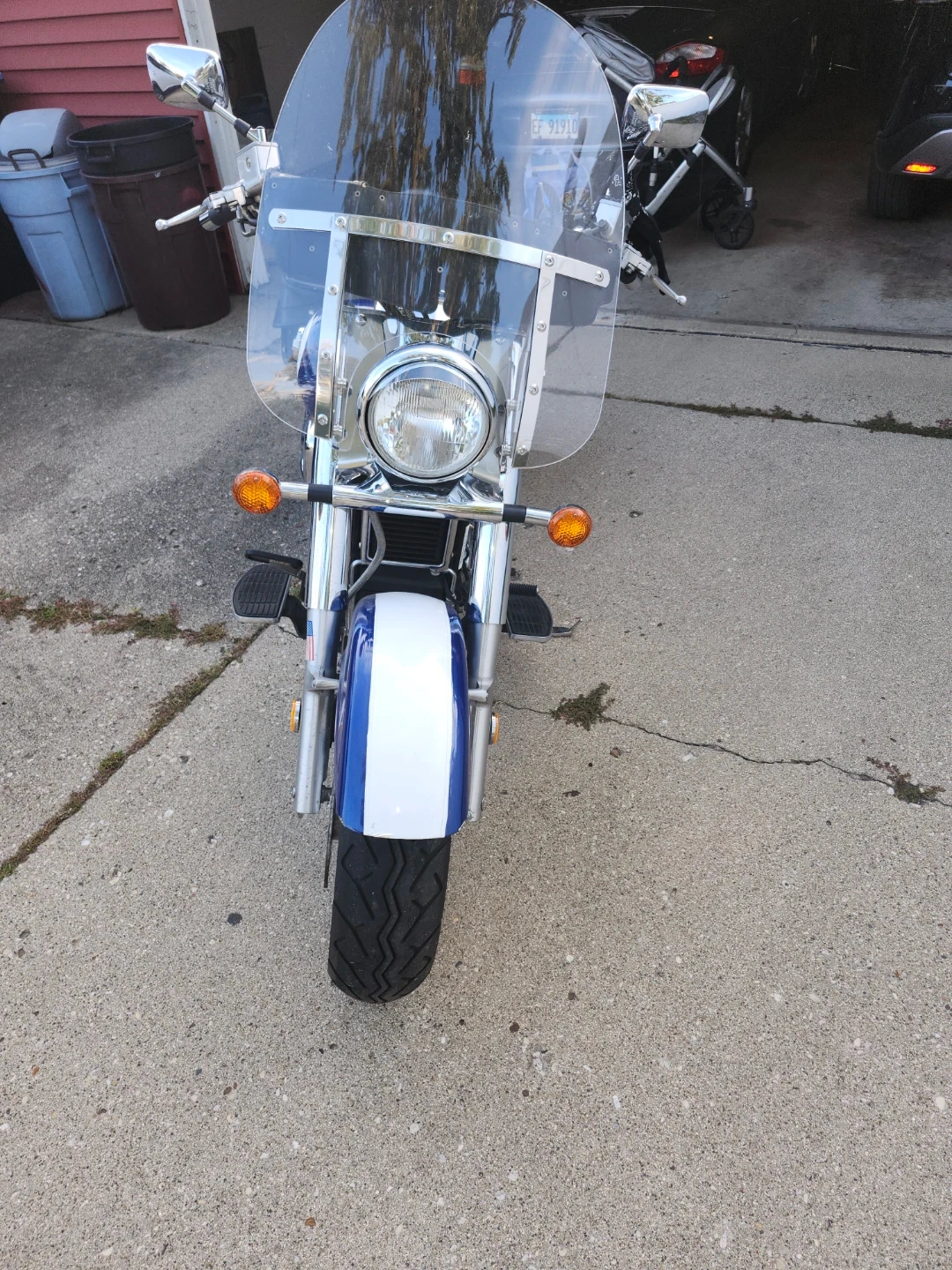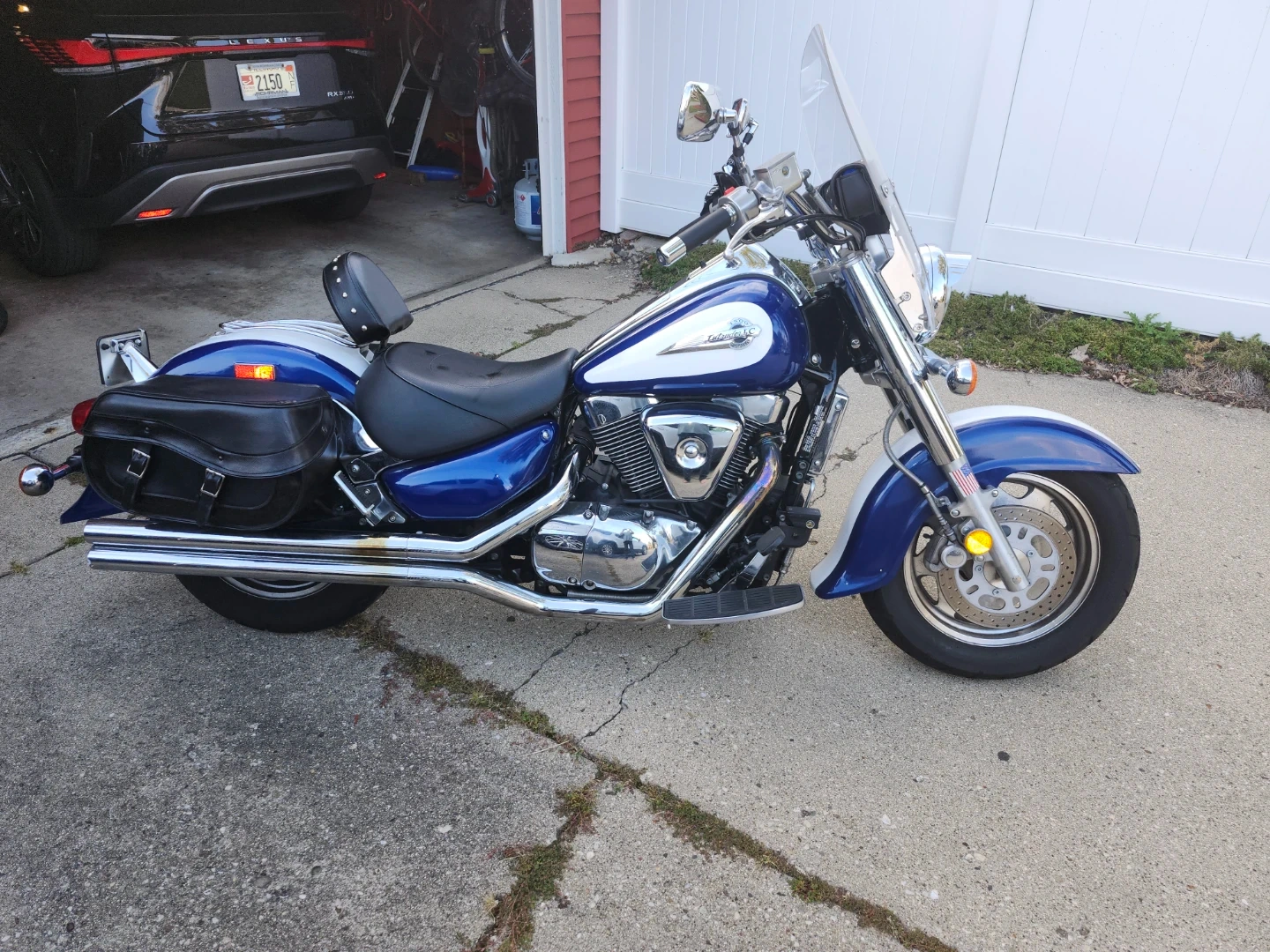 This is a blue and white Suzuki motorcycle. It comes equipped with a large windshield and black leather saddlebags for storage. It's a cruiser style motorcycle, perfect for long rides. The cast has been garage, kept. Three thousand eight hundred original miles original yellow and white has been wrapped blue and white new clutch brakes and recent oil change