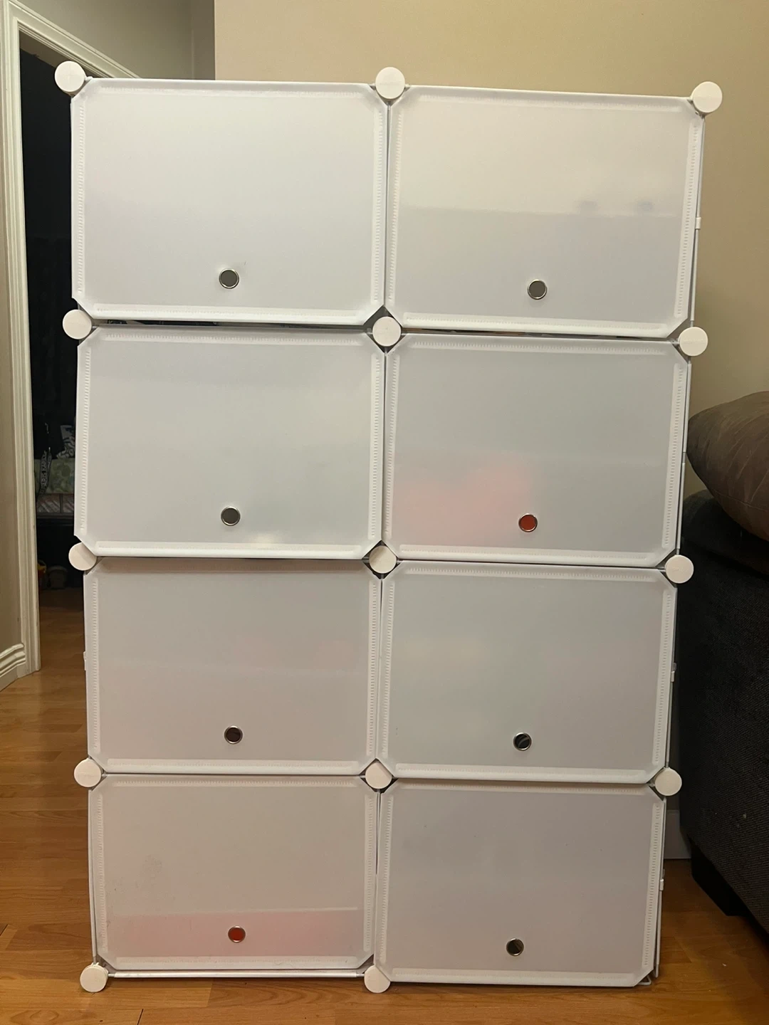 This is a white 8-cube modular storage organizer. It's made of plastic panels and connectors. It's great for storing shoes, books, or other small items.