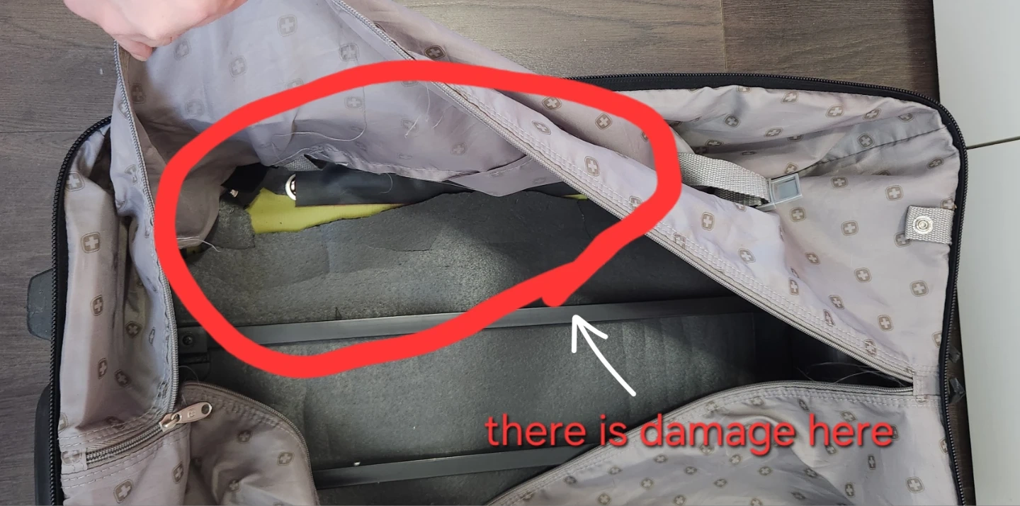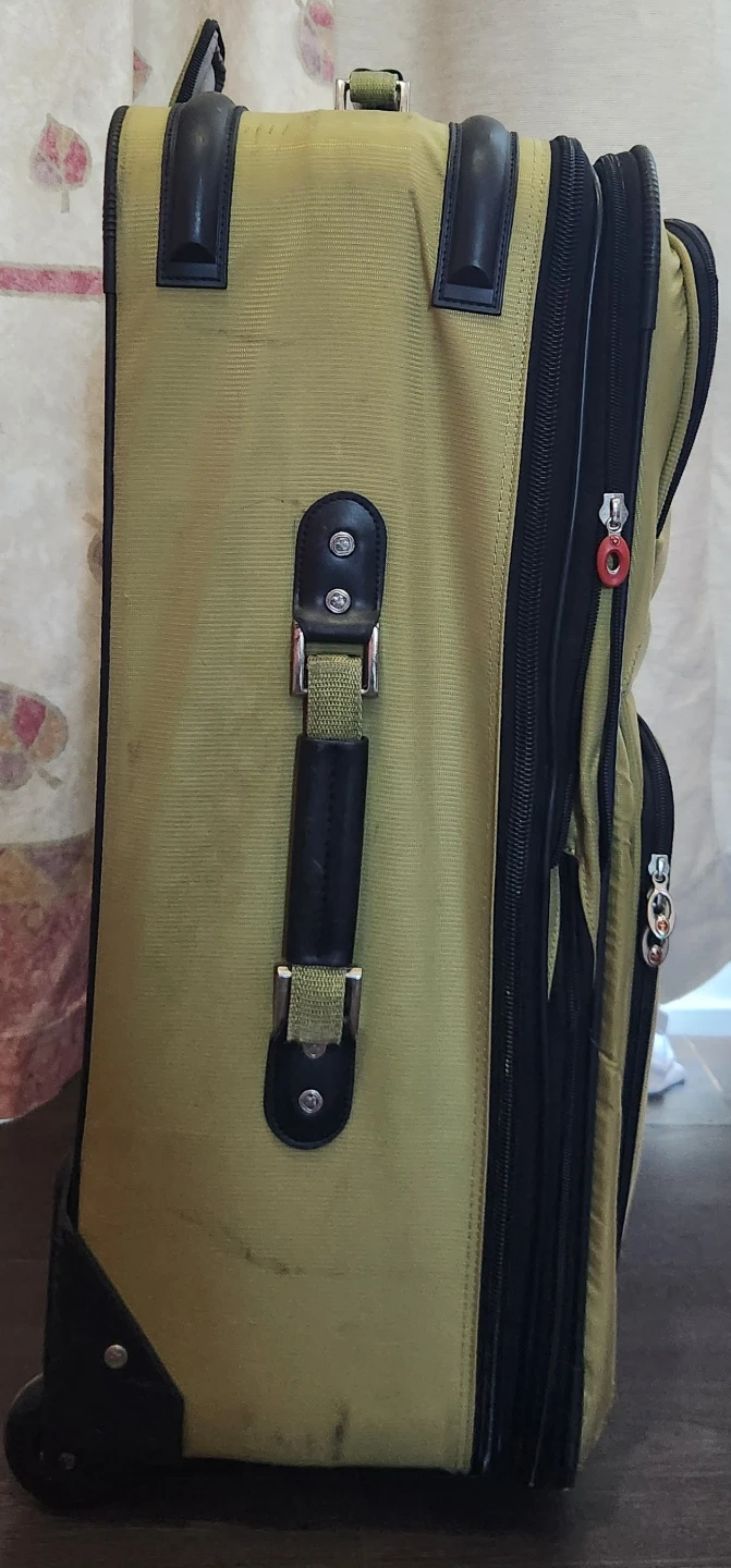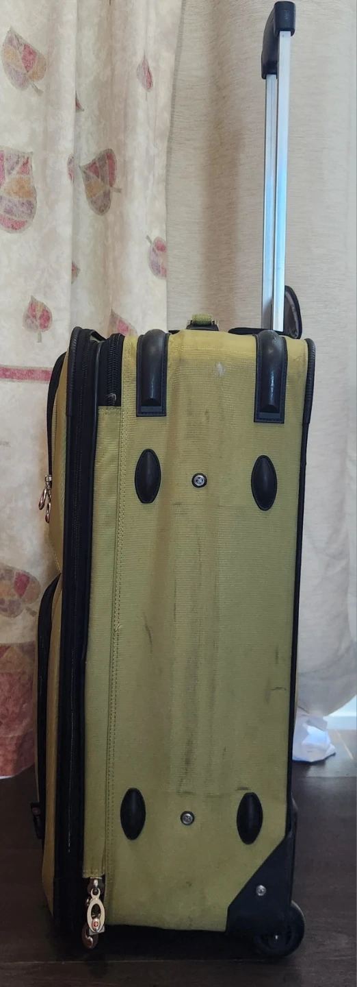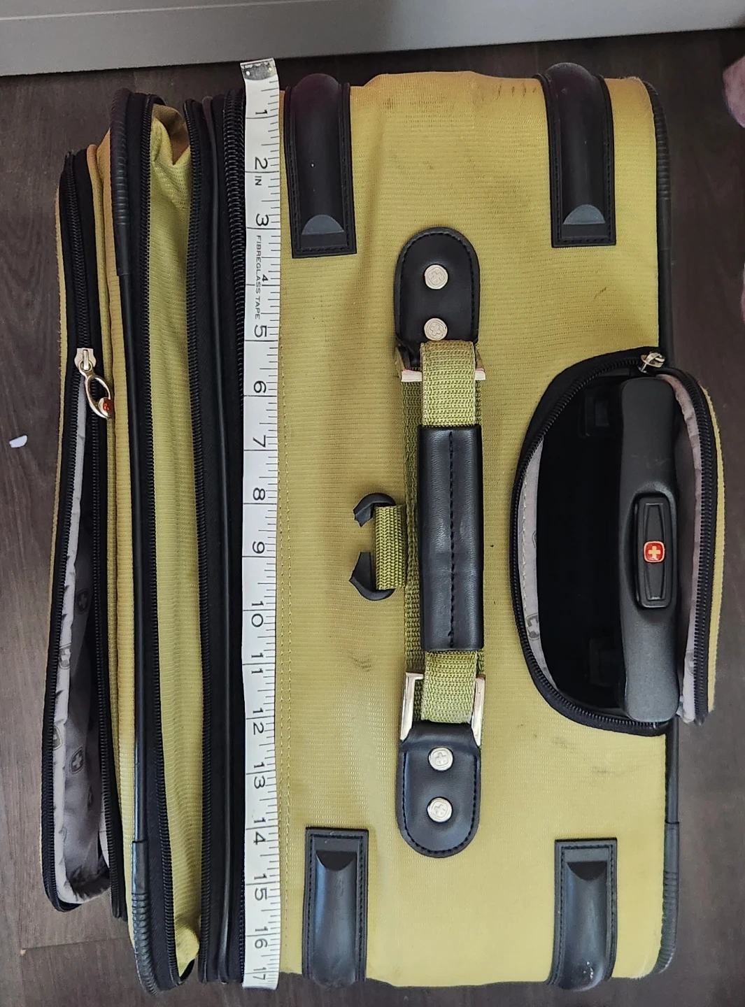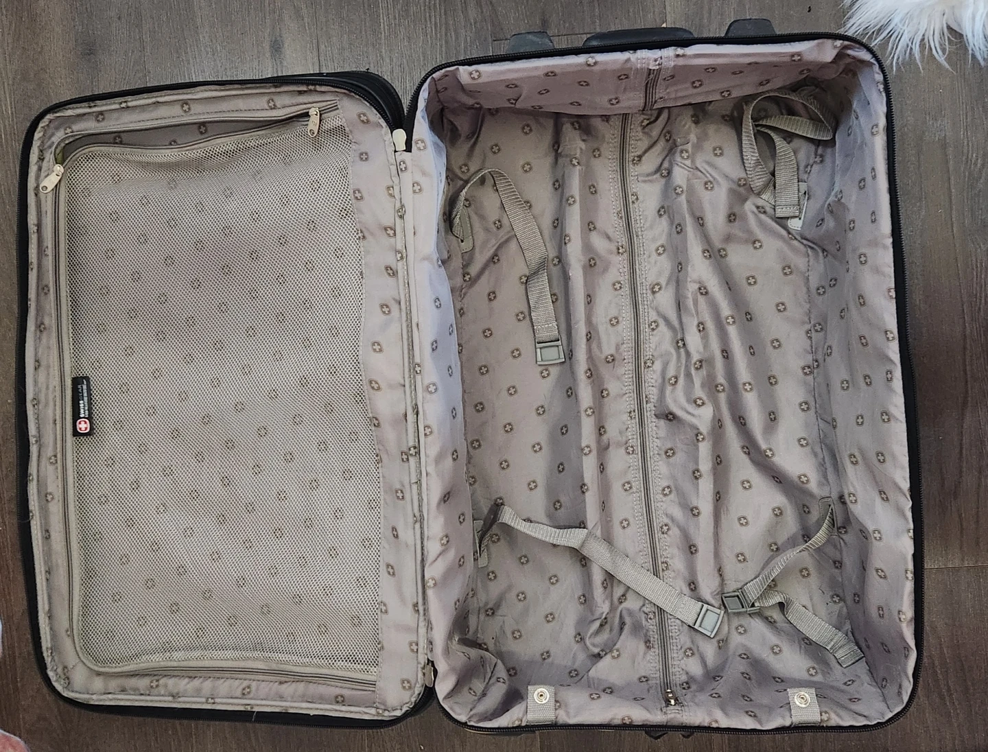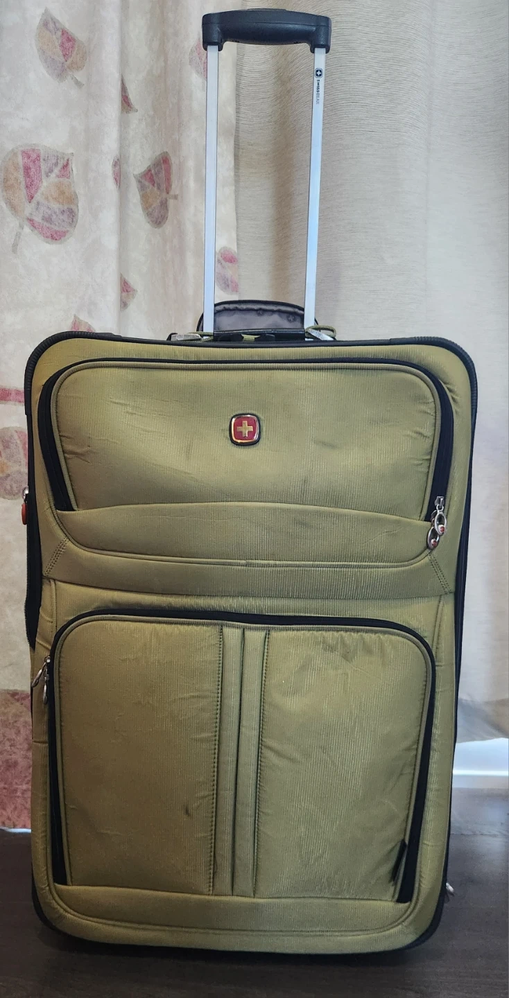 This is a Swiss Gear rolling suitcase in a olive green colour. It has a retractable handle and two wheels for easy transport. Multiple pockets for organization. There's damage in the inside of the case in the last picture.