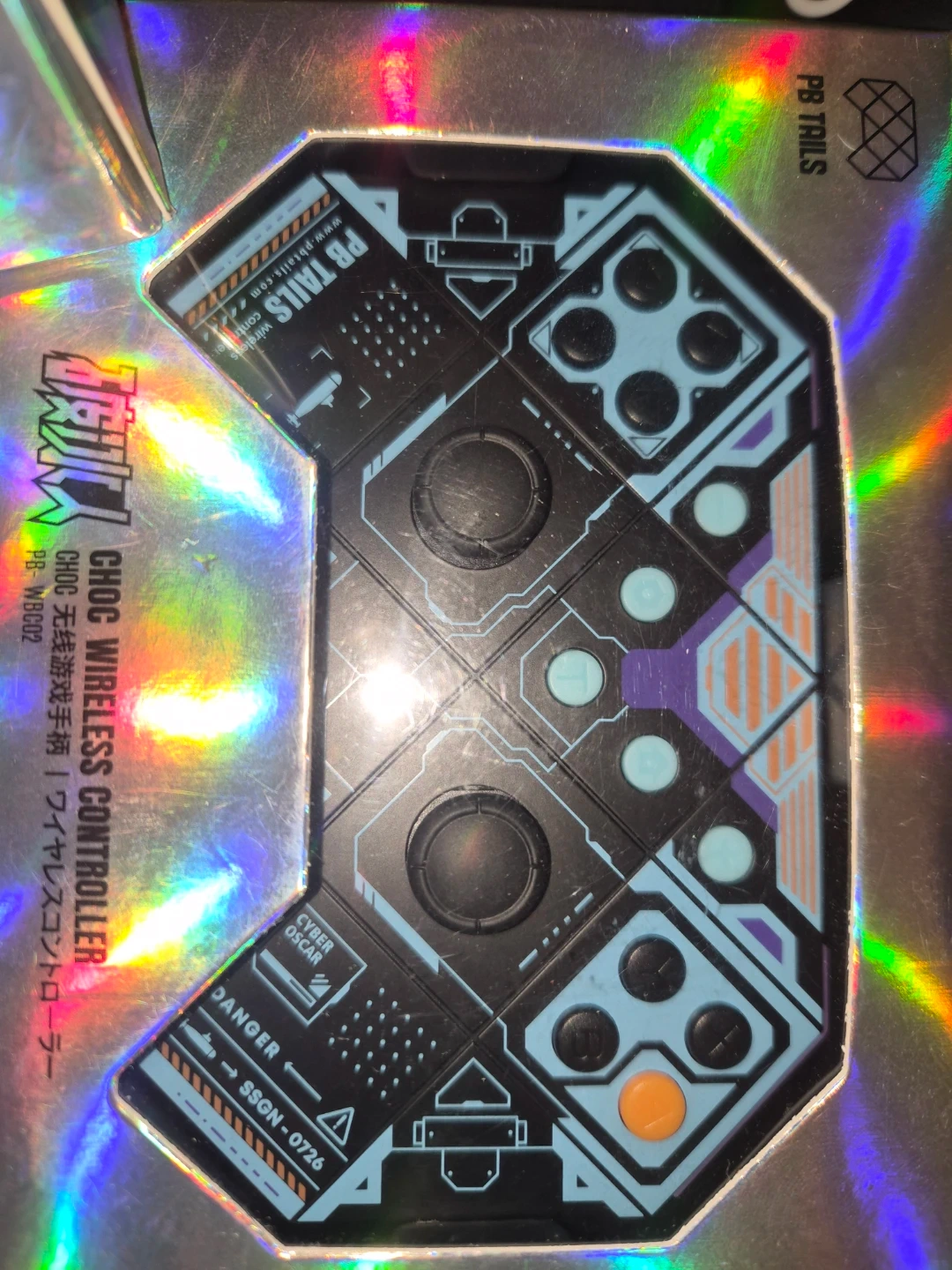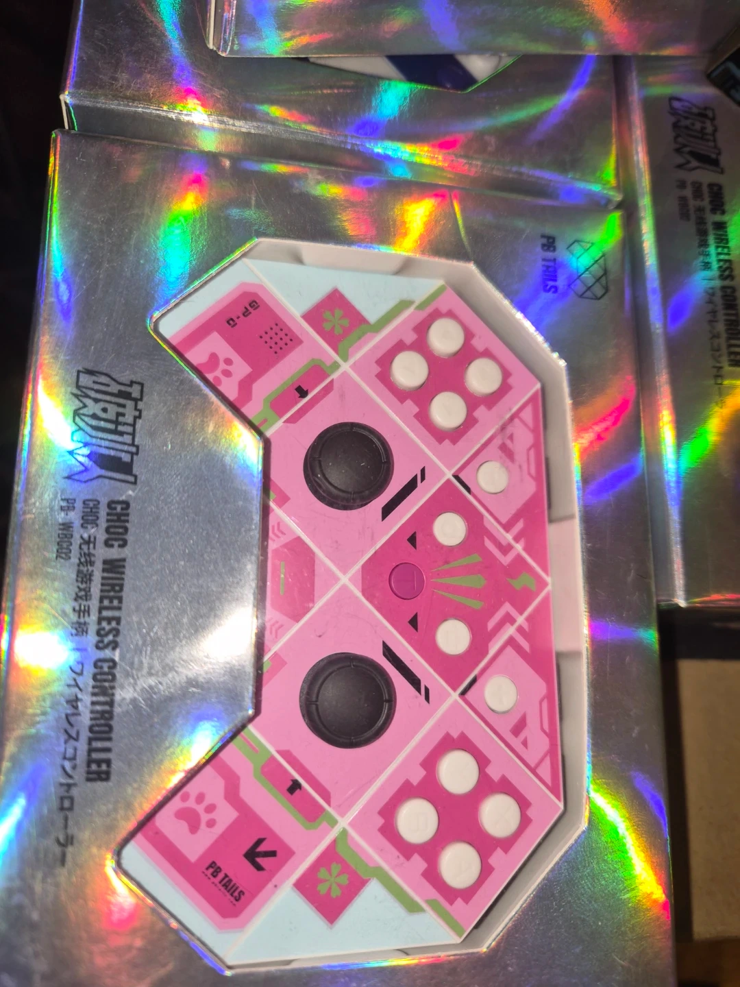 PB TAILS CHOC wireless controller. Available in blue and white striped, pink geometric, and black and purple cyber designs. Connects wirelessly for gaming. Controller includes two joysticks, directional buttons, and action buttons.