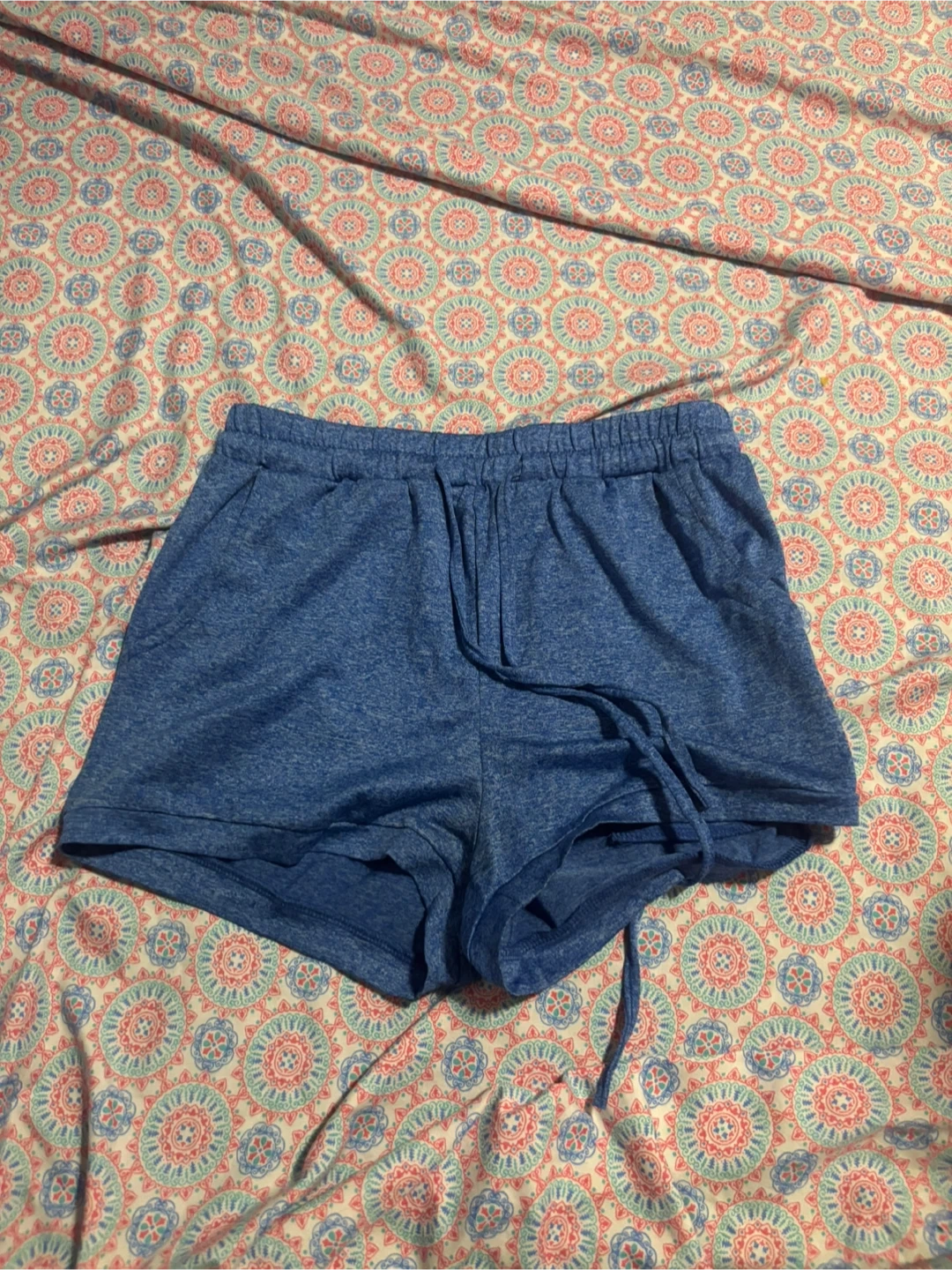 These blue heathered athletic shorts feature an elastic waistband with a drawstring for a secure fit. They're made from a soft, breathable fabric, perfect for workouts or lounging. Side pockets offer convenient storage.