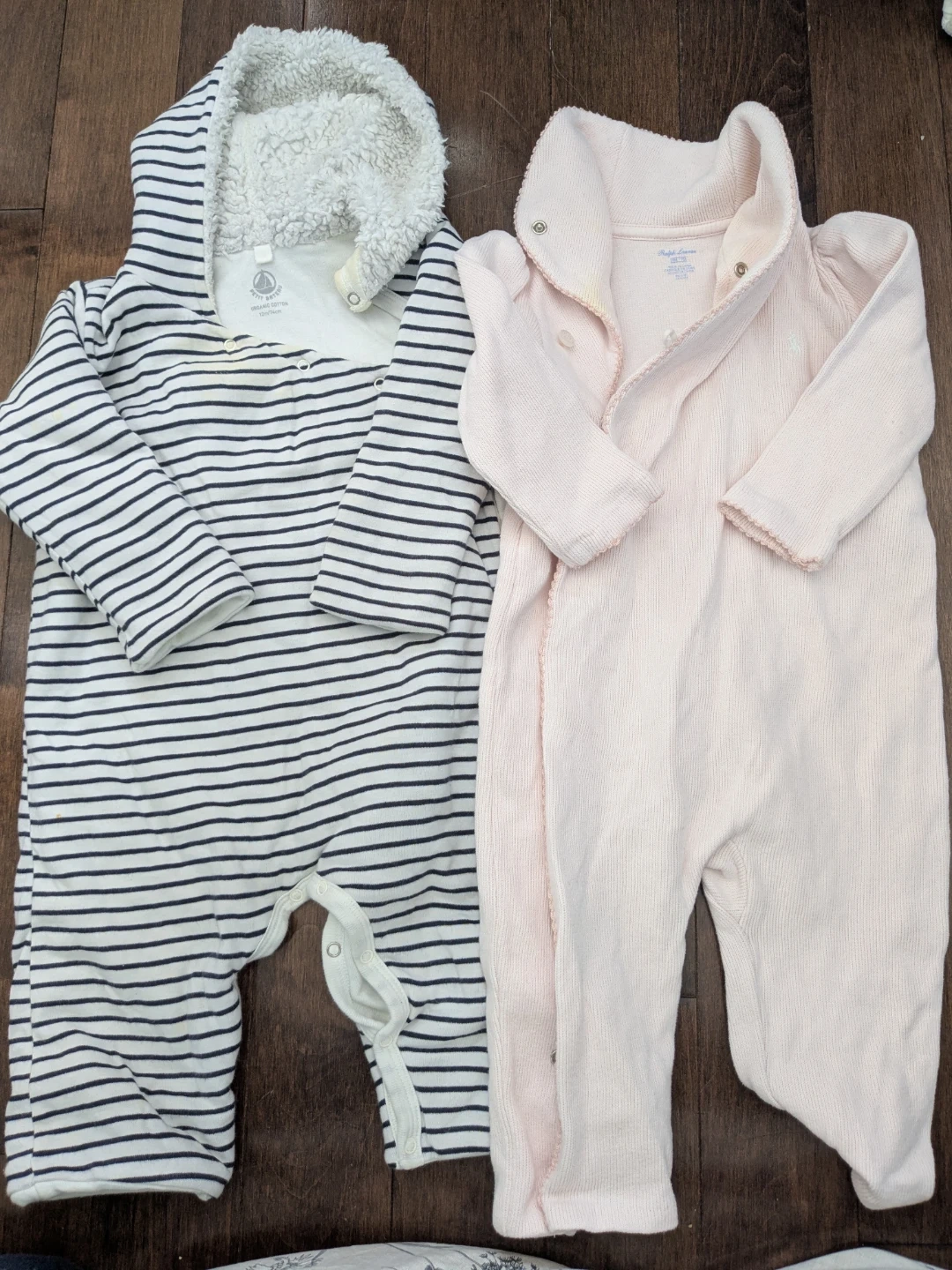 Ralph Lauren 12M and PETIT BATEAU 9M. Both have noticeable milk stains, but looking for someone who wouldn't mind using them as they are.