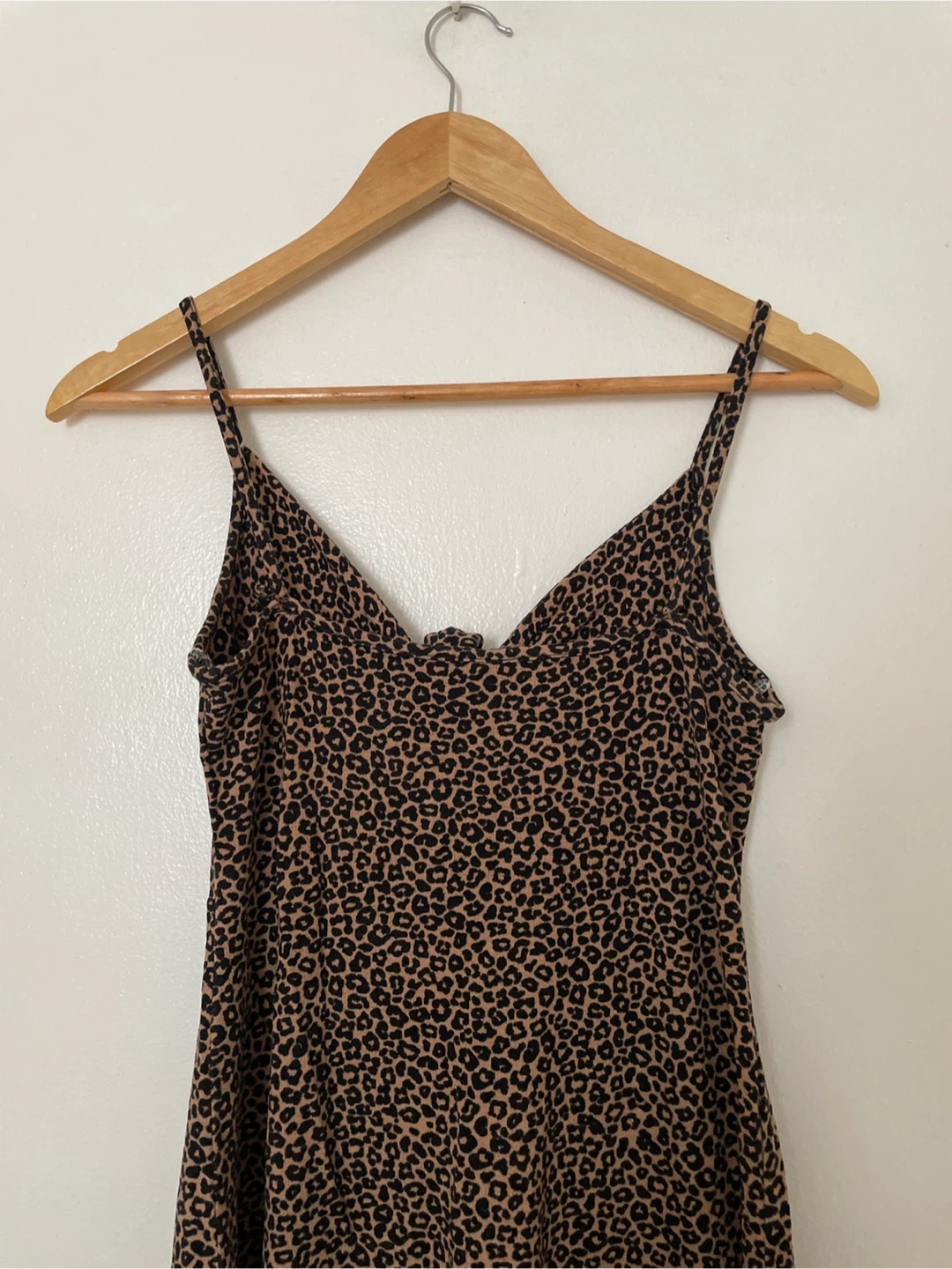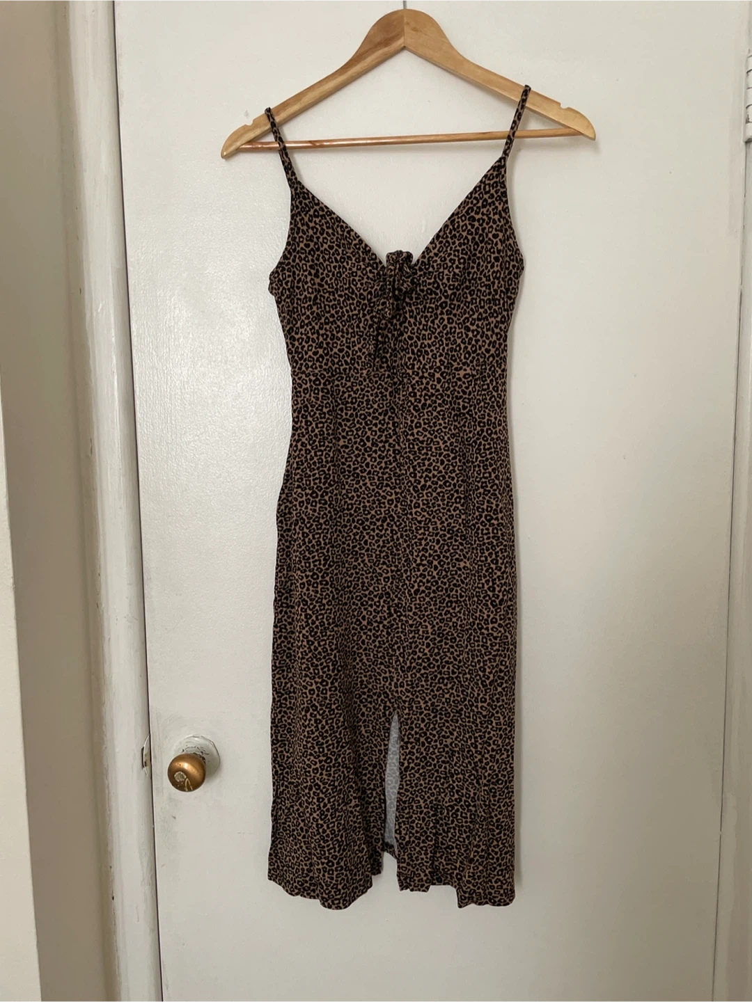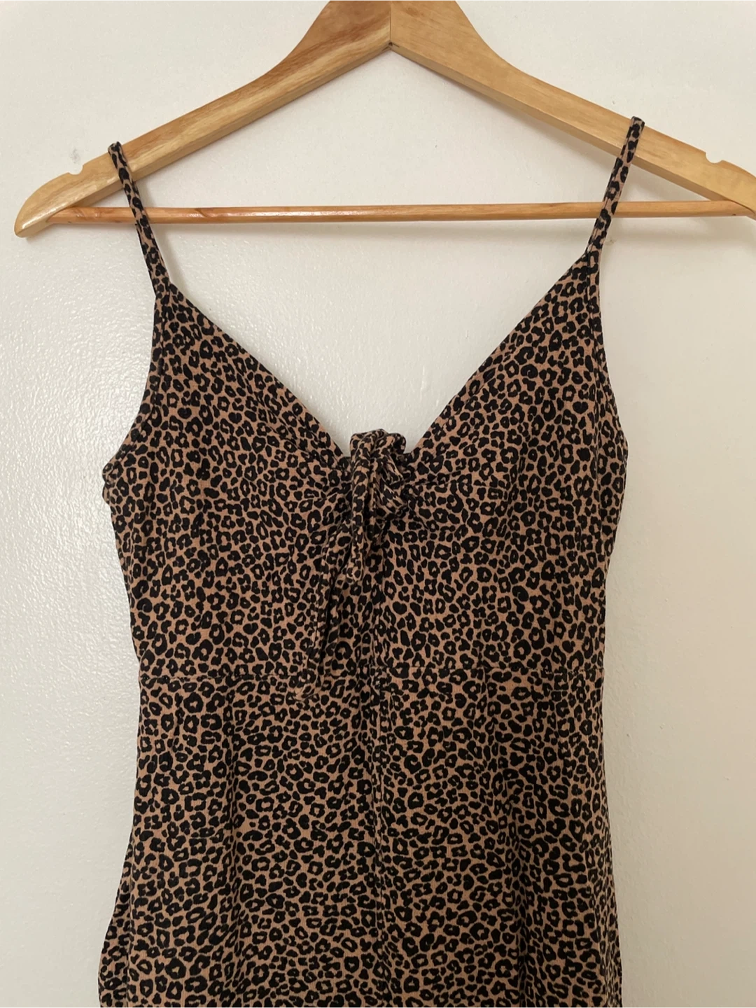 A stylish leopard print dress with thin straps and a tie-front detail. It has a V-neckline and a flattering cut. This piece is great for a night out or a casual summer day! Size Medium.