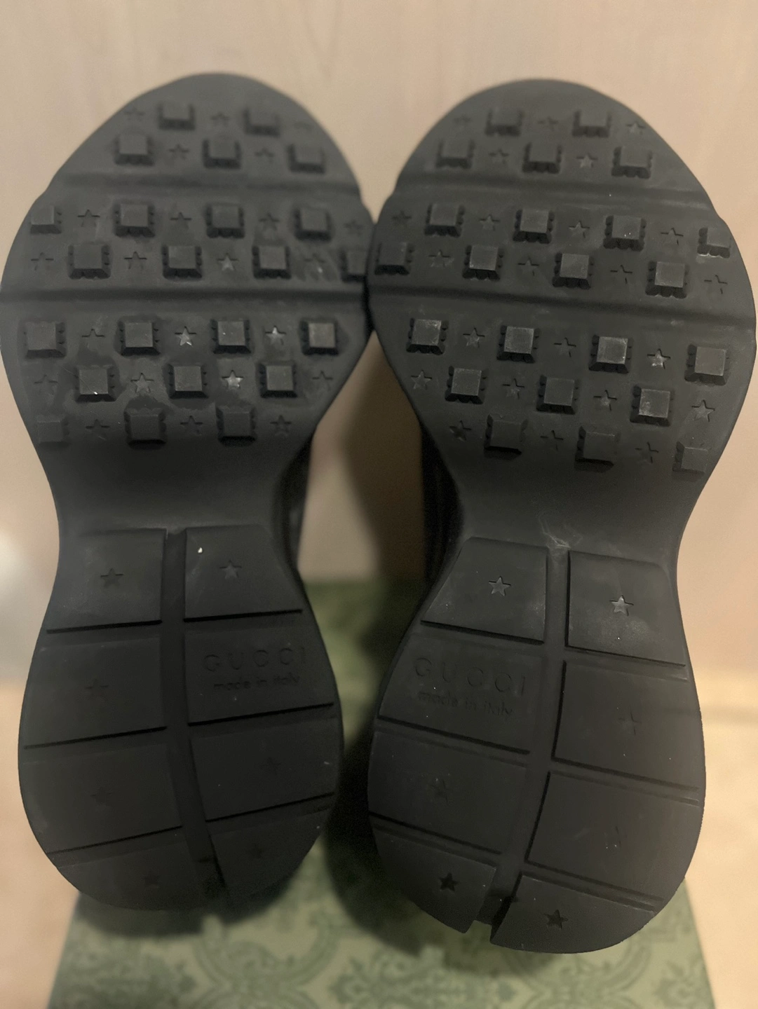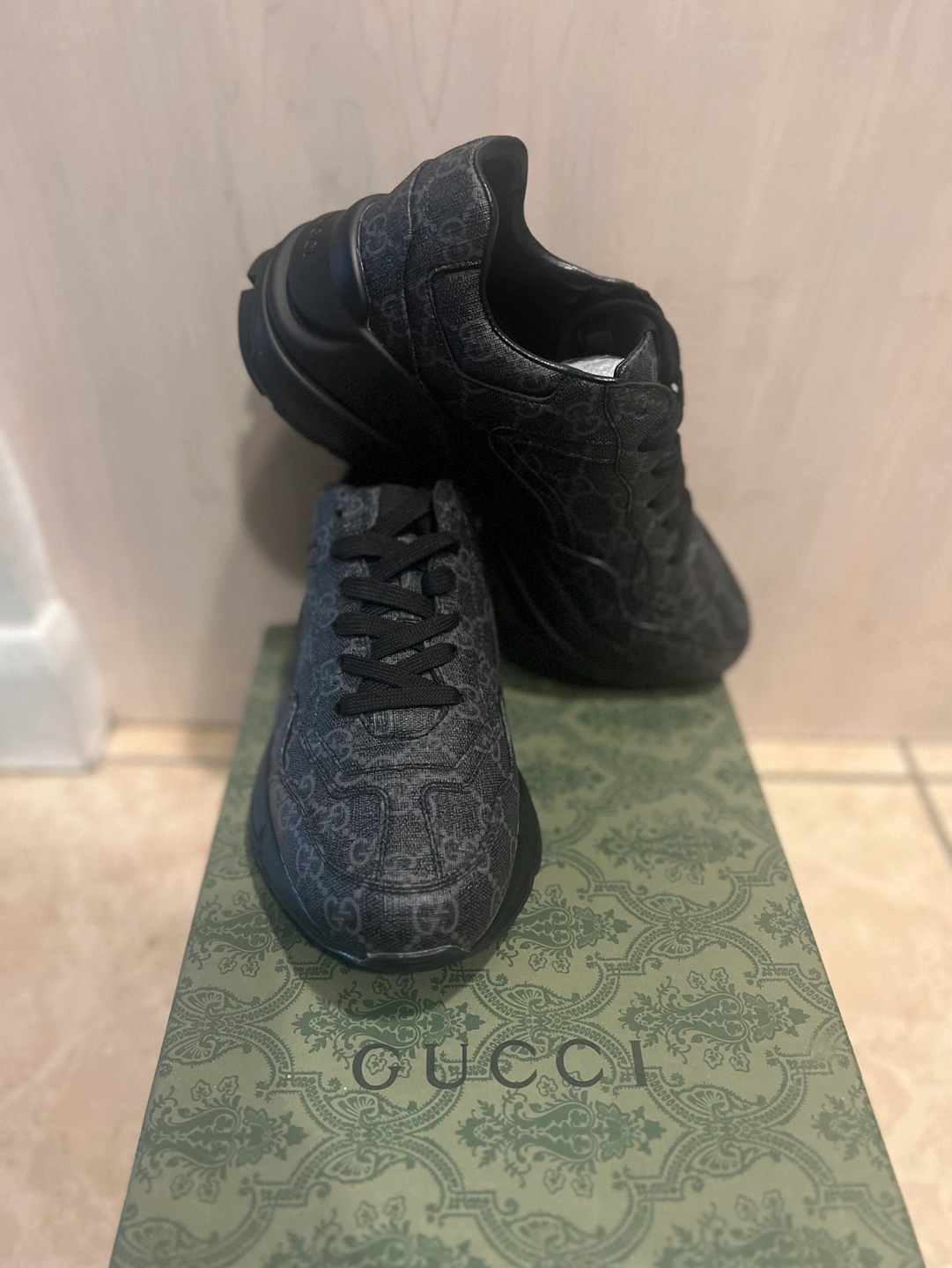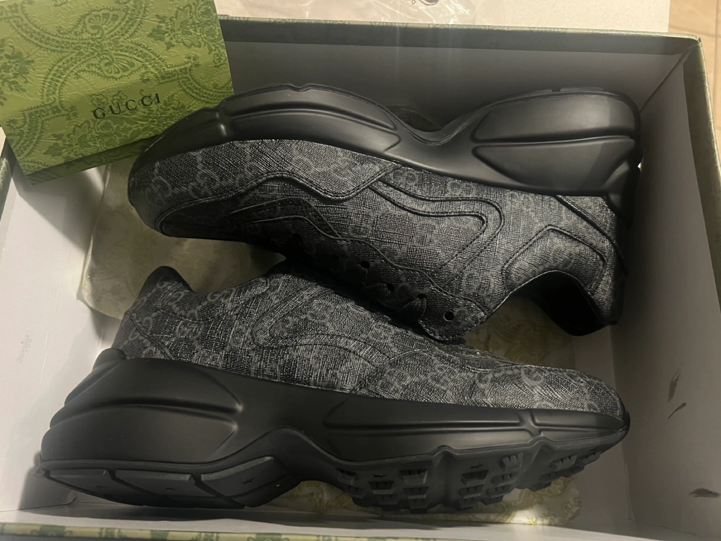 Gucci Rhyton sneakers. Black on black GG pattern. Chunky sole. Low-top style. Lace-up closure. Comes in original box.