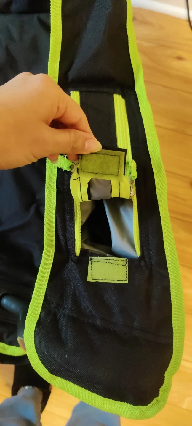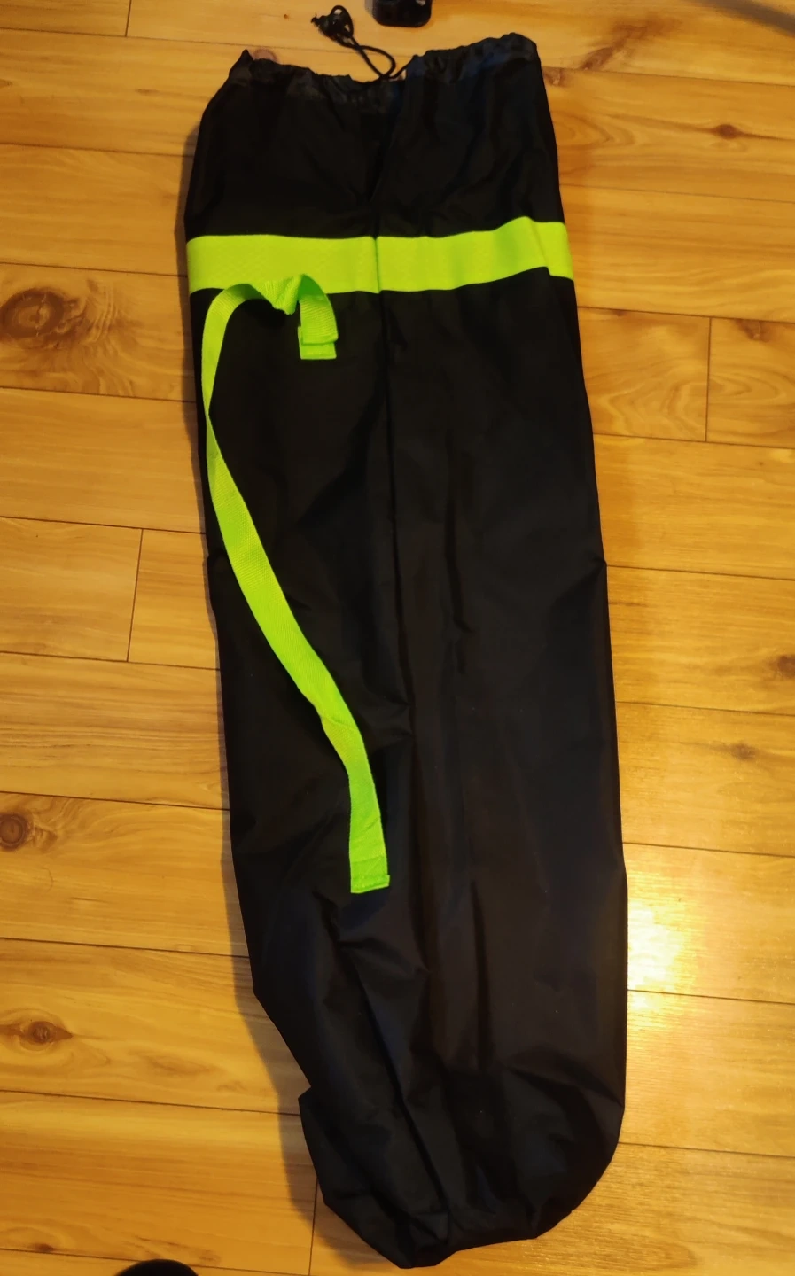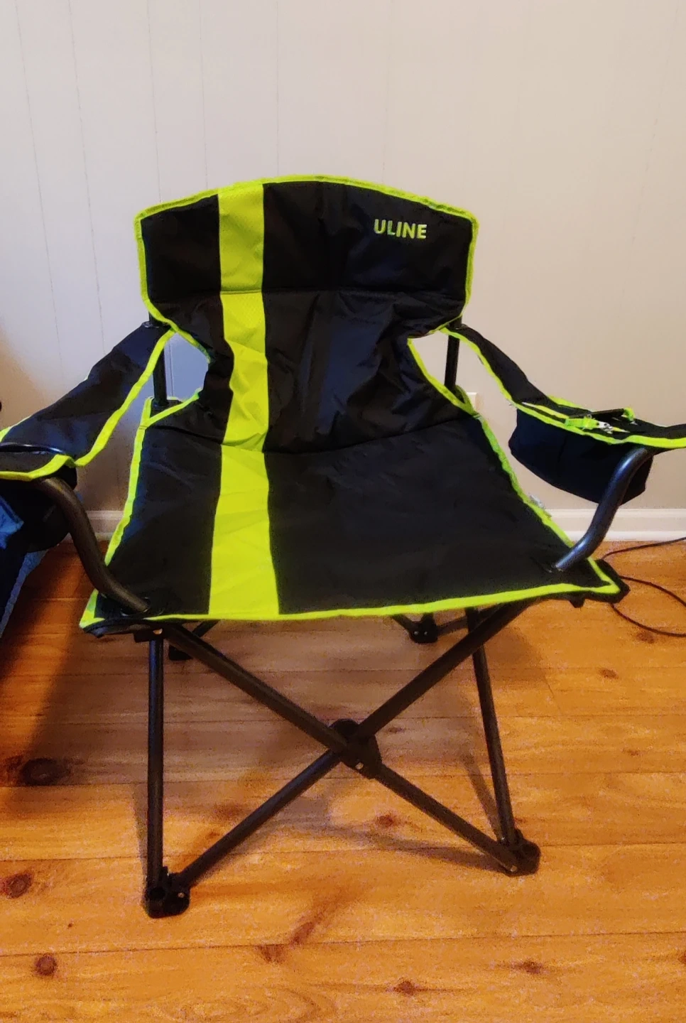 This Uline folding camp chair is black with bright green accents. It features a built-in cup holder on one armrest. It's made of durable fabric and has a sturdy metal frame. Includes a carrying bag for easy transport!