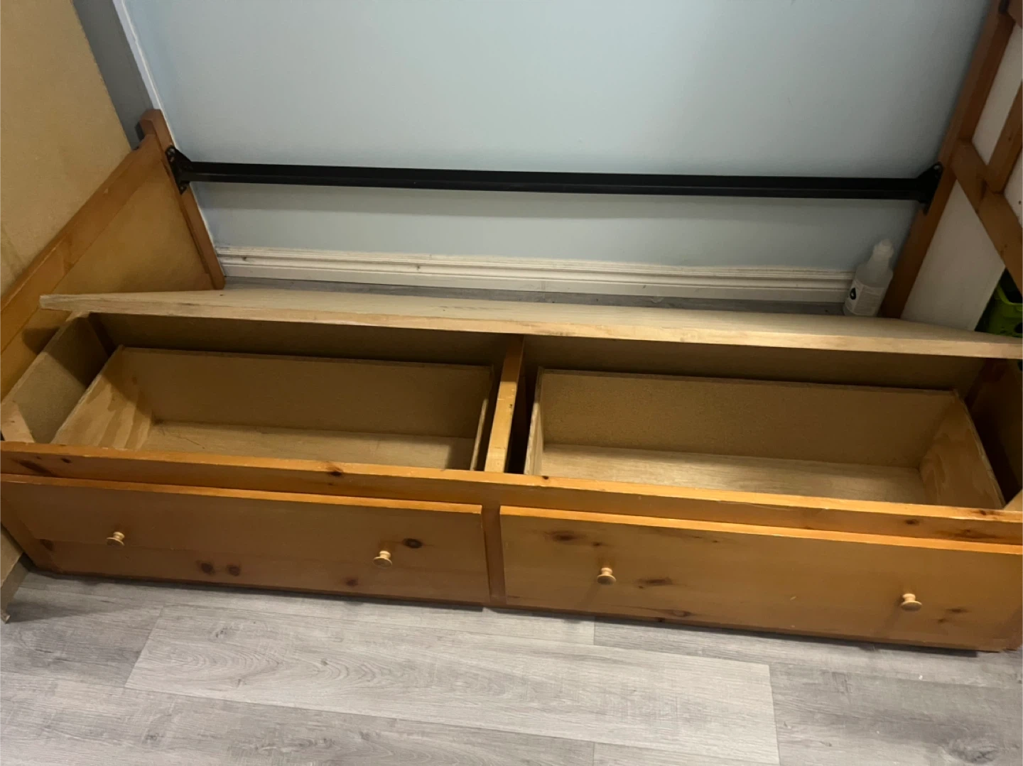 Twin Bed is in good condition; selling only ; Bed is a hard wood and sturdy; no mattress; pick up only; PM me if interested; Thanks