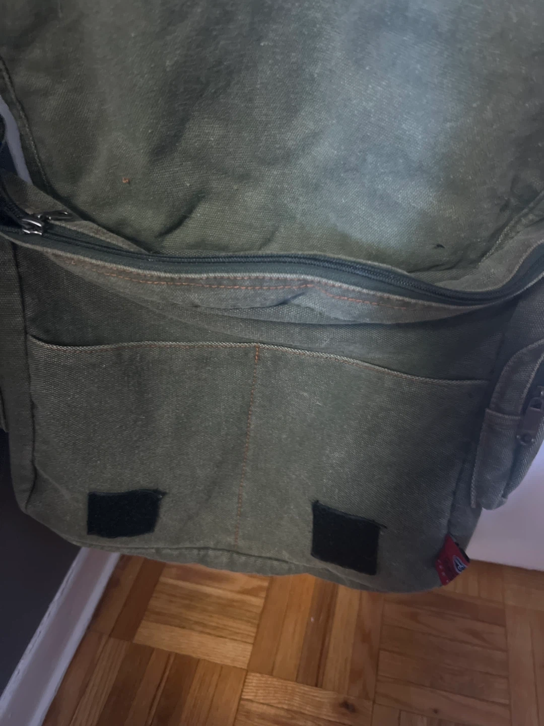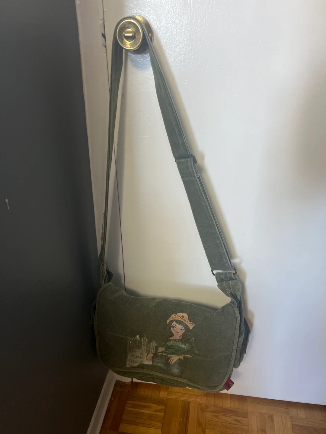 A practical olive green messenger bag featuring a charming graphic print of a girl in a hat with a city skyline. It's made from durable canvas material and has multiple pockets for organization. This bag is great for everyday use!