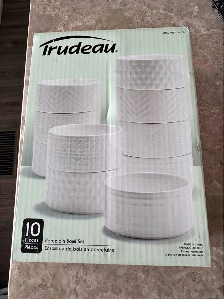 New Trudeau 10 piece porcelain bowl set. Has different textured patterns on the bowls. Great for serving dips, snacks, or small dishes.