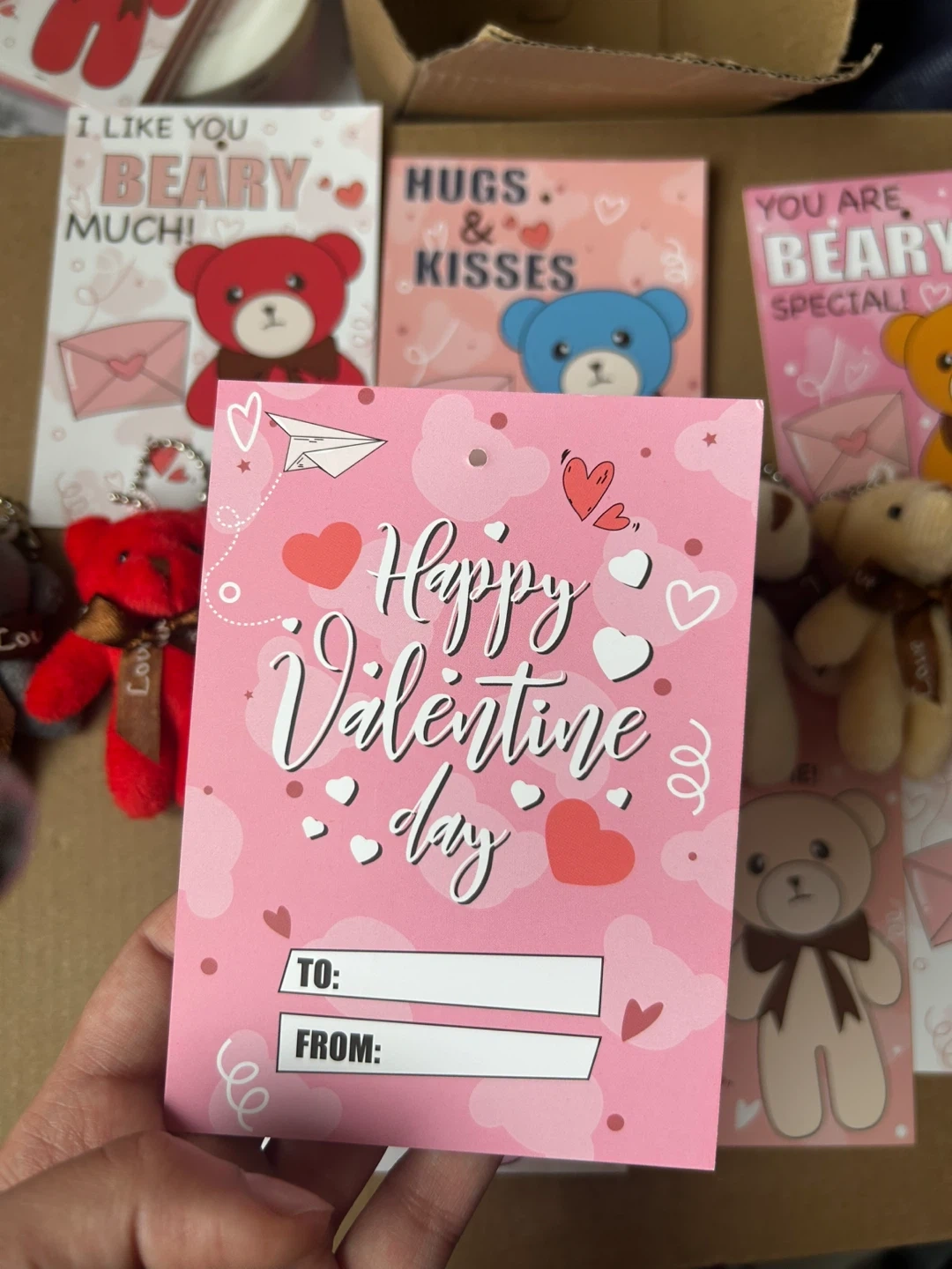 plush teddy bear keychains with Valentine's Day themed cards. Each bear is attached to a card with a sweet message, perfect for gifting. These are great little treats to give out!