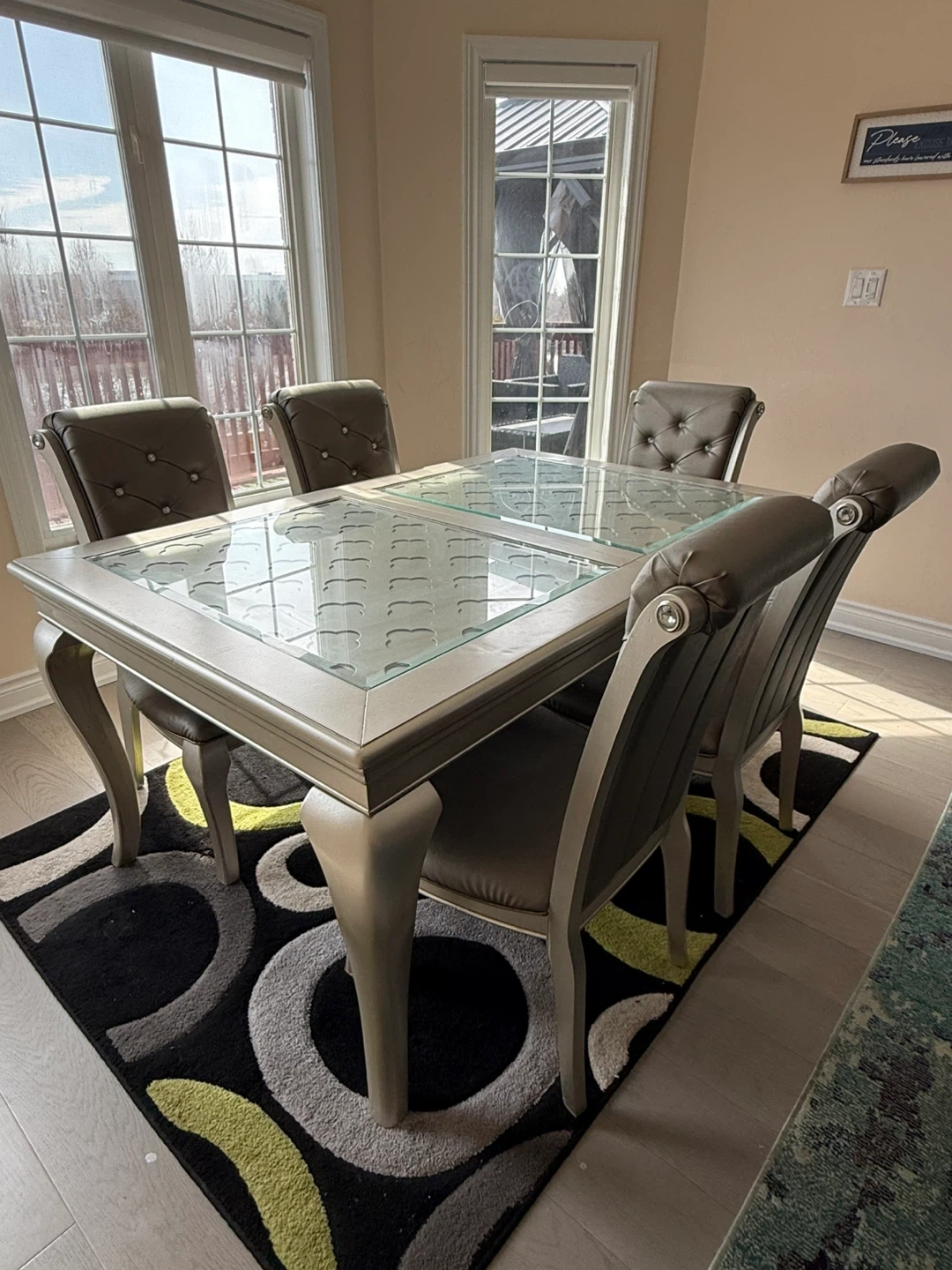 Includes a rectangular dining table with a glass top and six upholstered chairs. The chairs have tufted backs with crystal-like accents. This set's a great fit for your dining room!