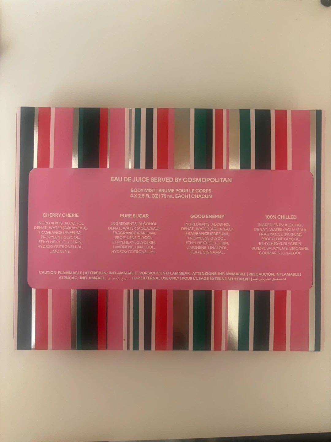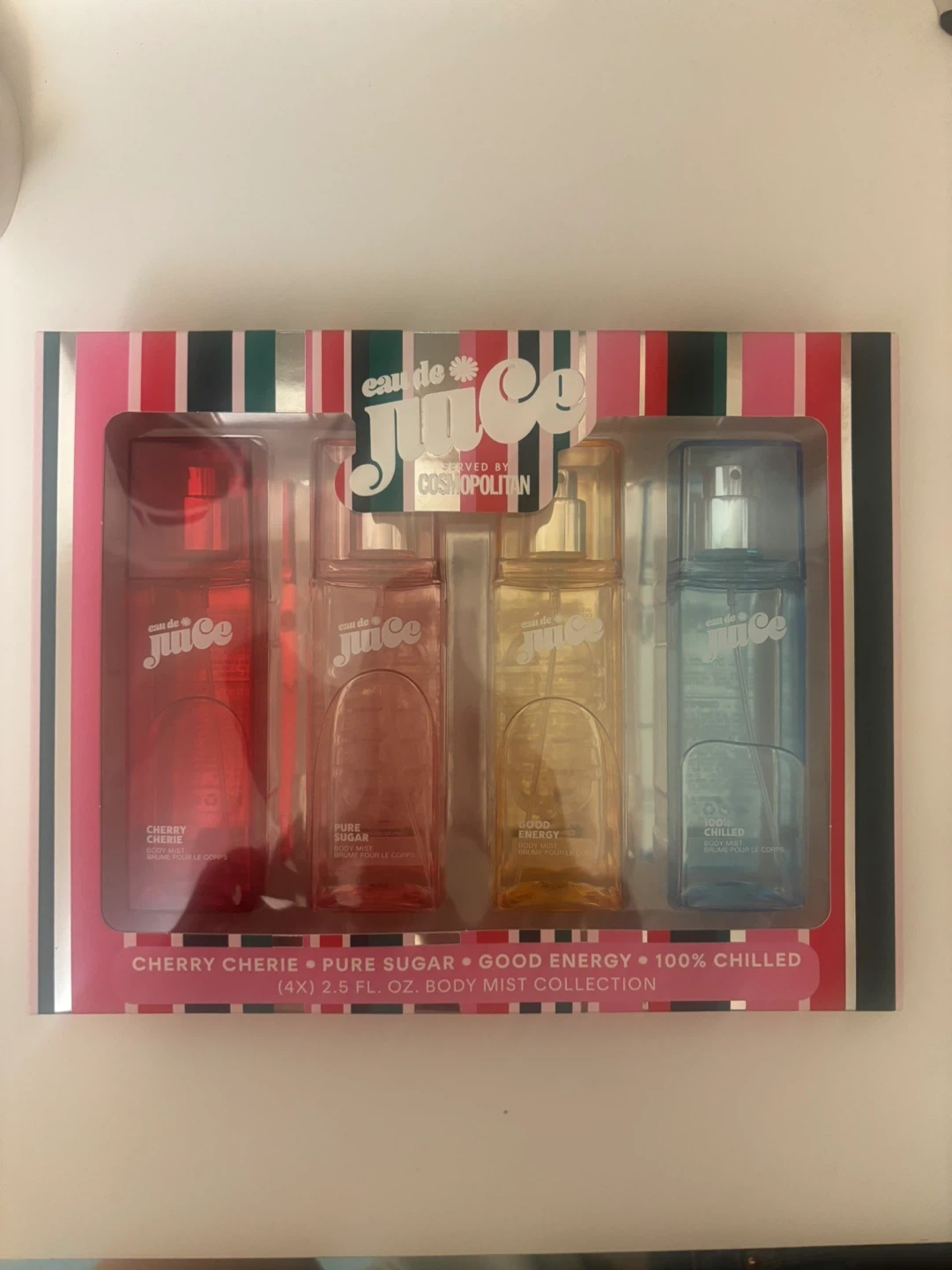 This brand new set includes four Eau de Juice body mists: Cherry Cherie, Pure Sugar, Good Energy, and 100% Chilled. Each mist is 2.5 fl. oz. or 75 ml. It's a great collection for trying different scents.