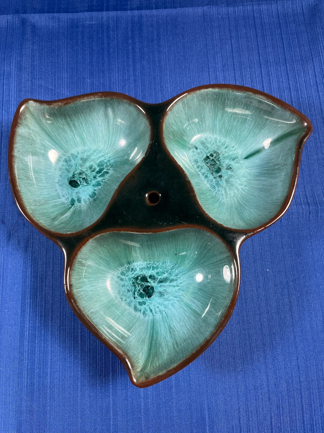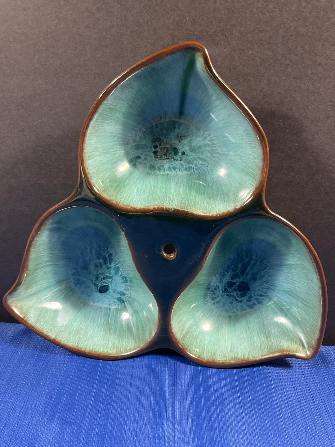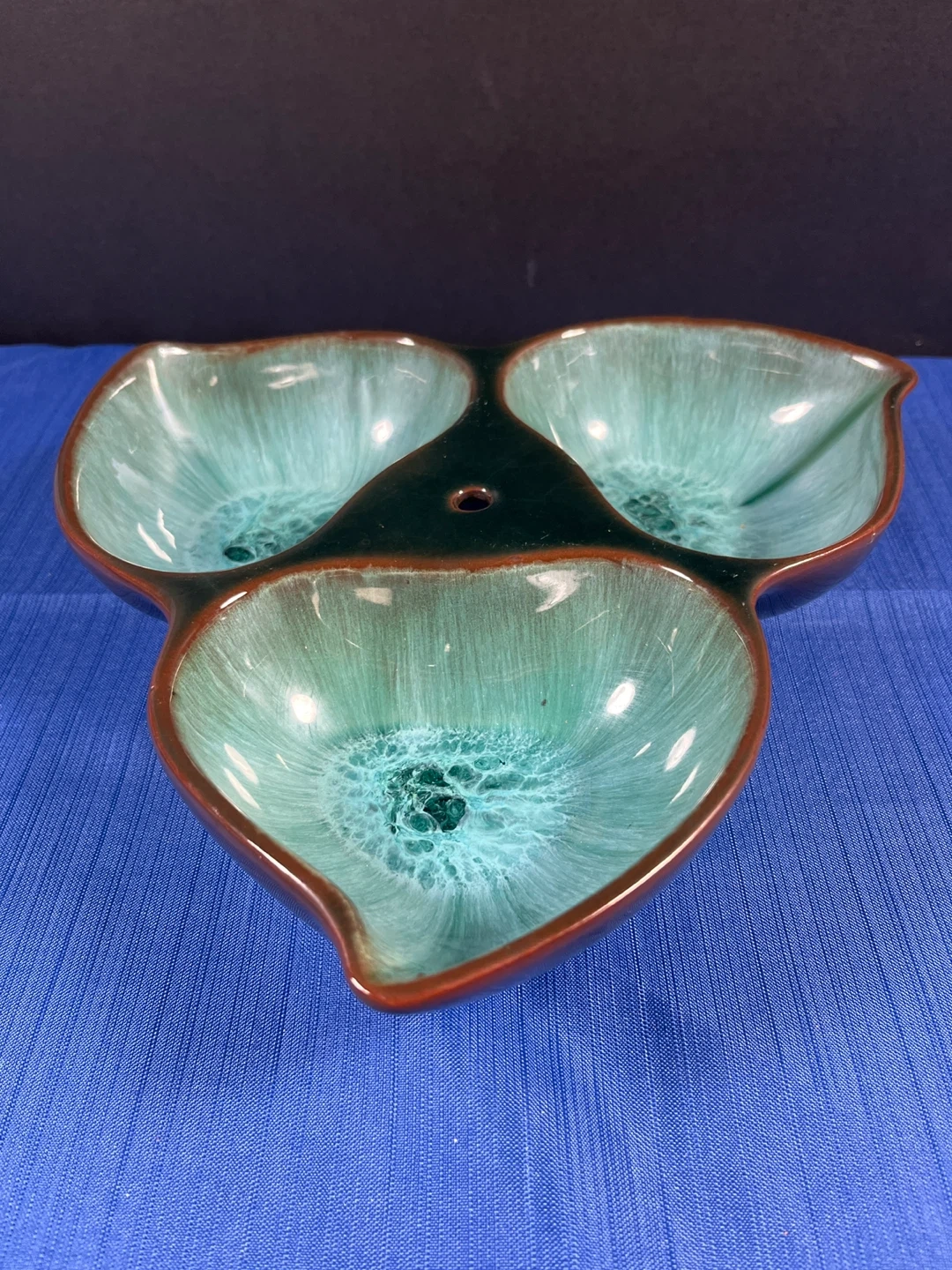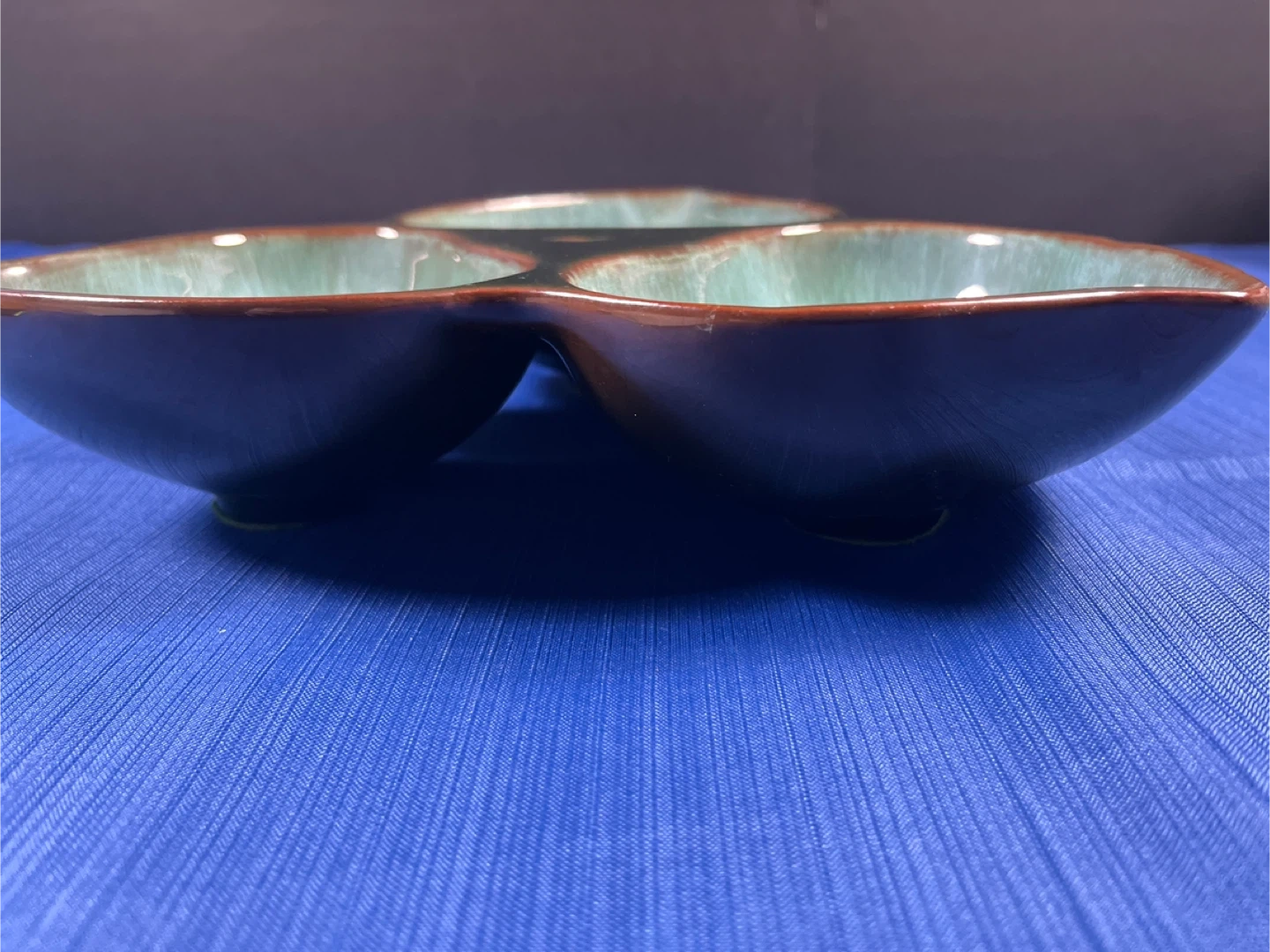 This is a vintage Blue Mountain Pottery three-part serving dish, showcasing a beautiful green and blue glaze. This dish has been previously enjoyed and is in good condition, ready to add a touch of retro charm to your table setting. This eye-catching piece is perfect for serving snacks or appetizers.