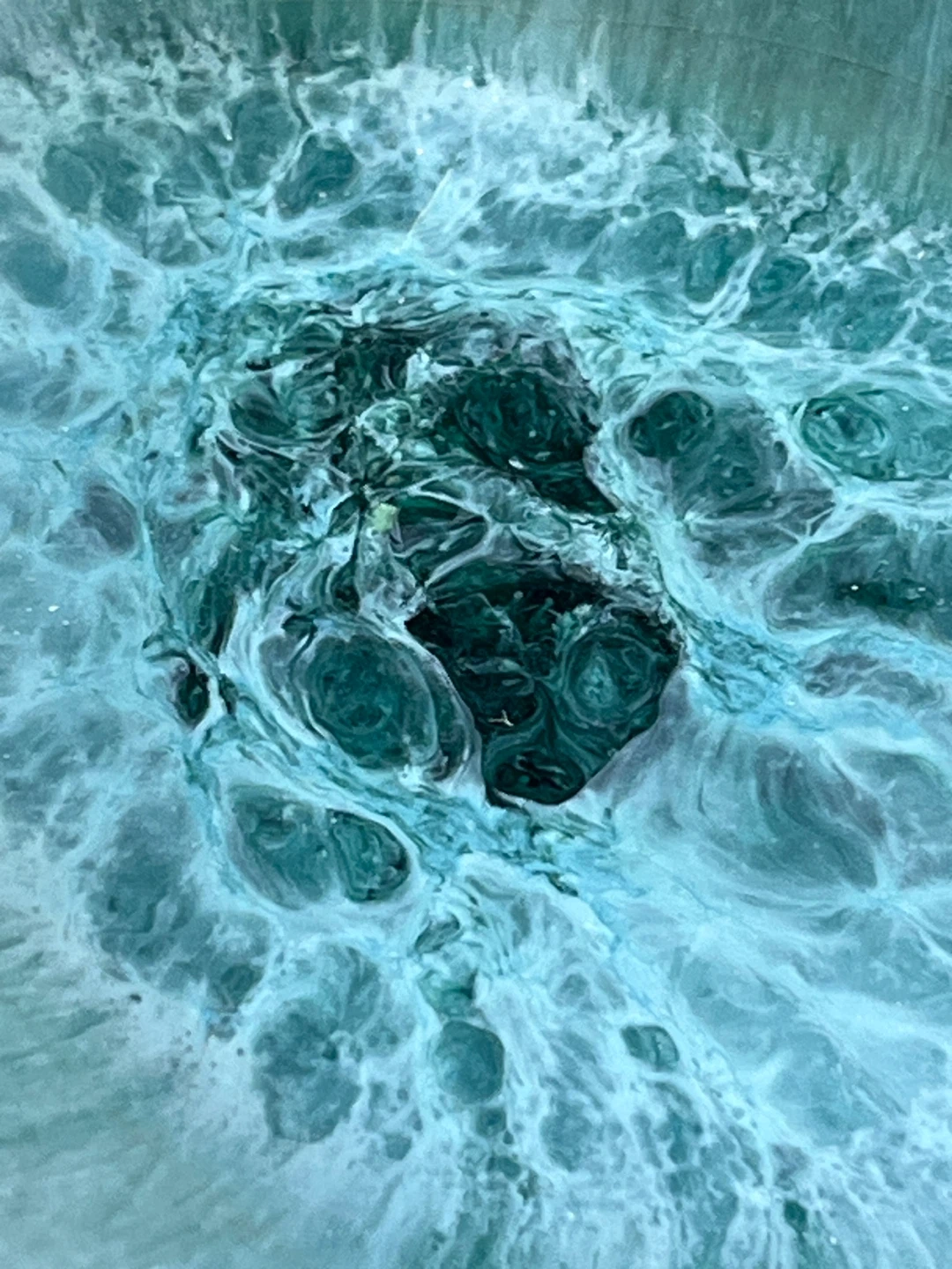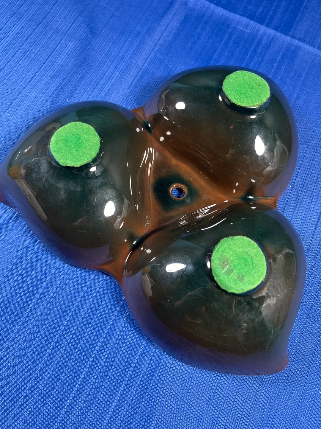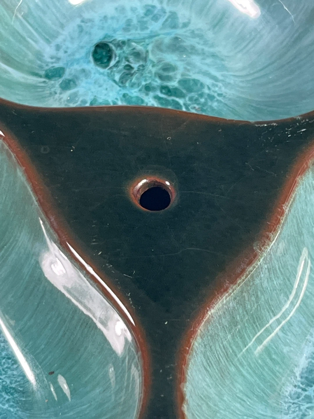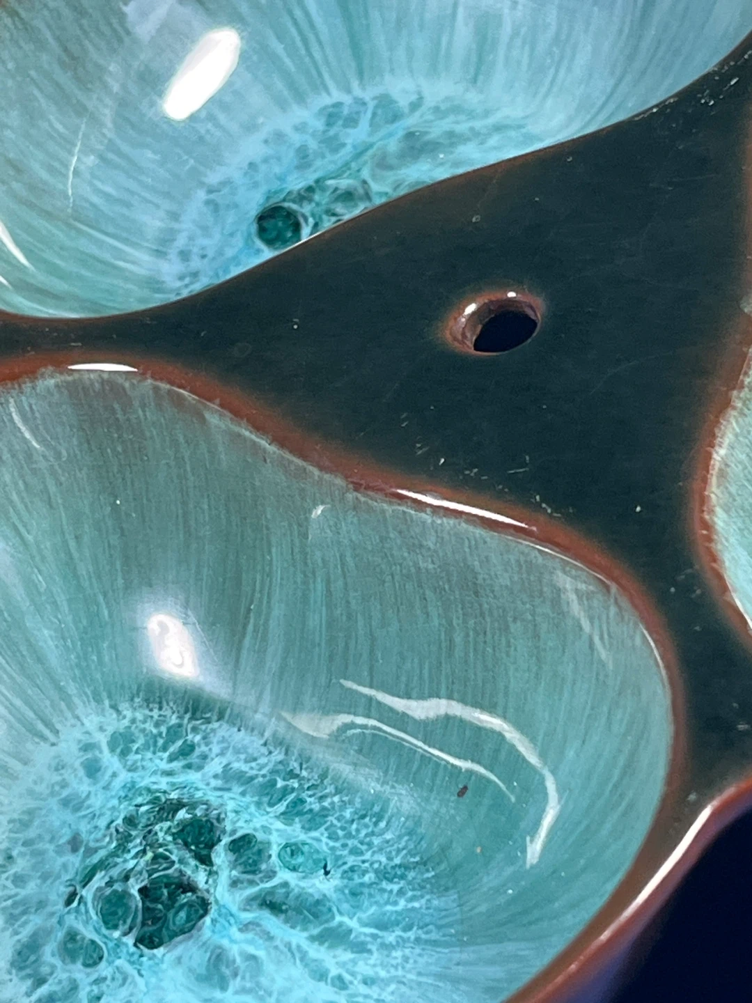 This is a vintage Blue Mountain Pottery three-part serving dish, showcasing a beautiful green and blue glaze. This dish has been previously enjoyed and is in good condition, ready to add a touch of retro charm to your table setting. This eye-catching piece is perfect for serving snacks or appetizers.