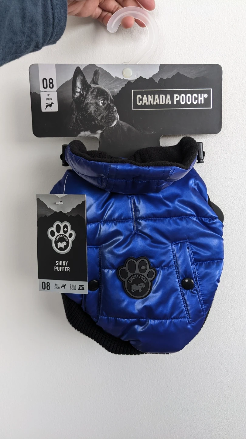 Canada Pooch Shiny Puffer jacket for dog or puppy in size 08 (small). It's a high quality vibrant blue jacket with leash opening and front velcro. Keeps your dog warm and stylish! Brand new unused in original packaging. Retails for $50.