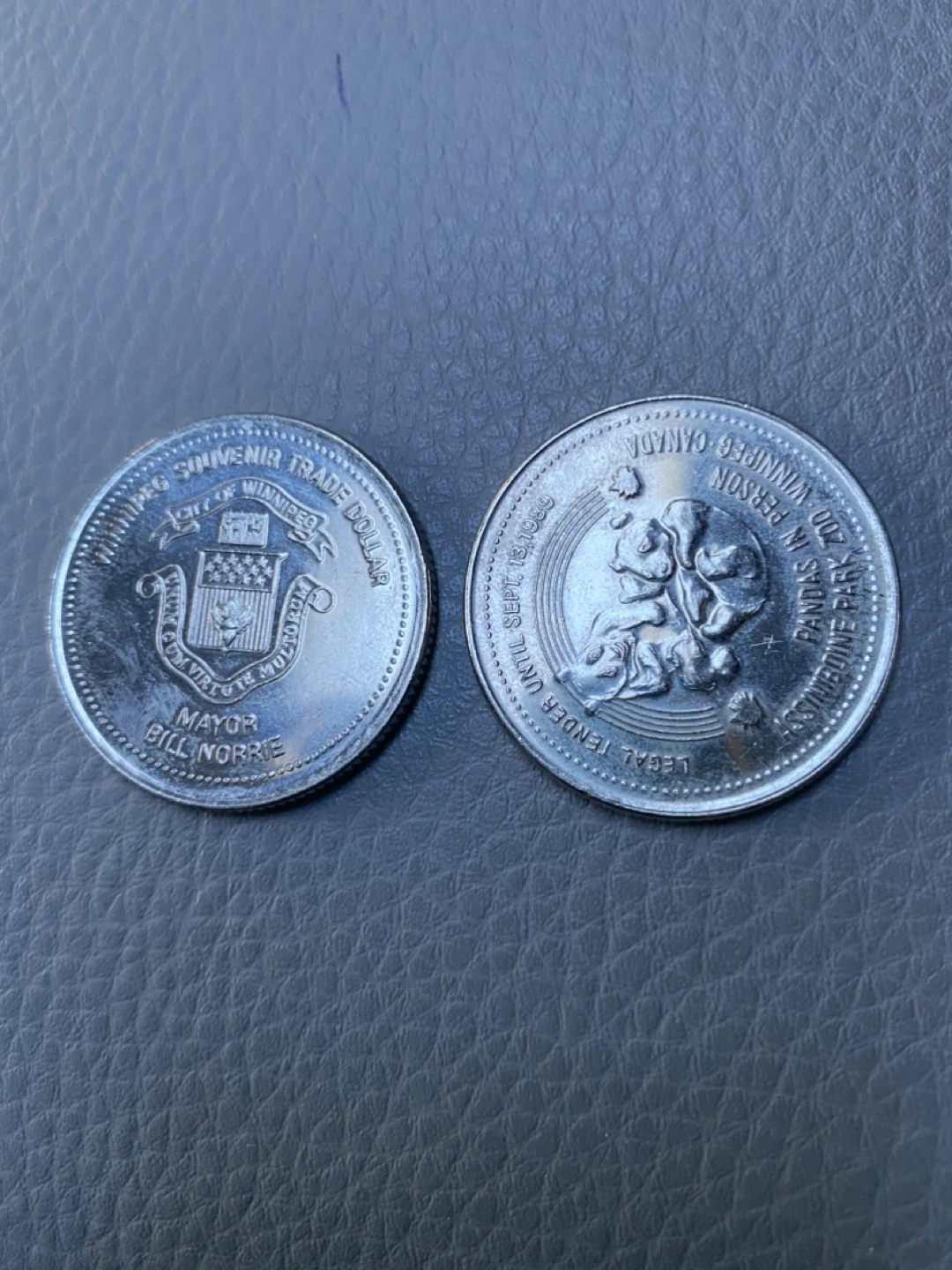 Winnipeg souvenir trade dollar. One side features the City of Winnipeg coat of arms and the name of the mayor, Bill Norrie. The other side has an image of pandas frolicking at the Winnipeg Zoo. Legal tender until Sept 1988