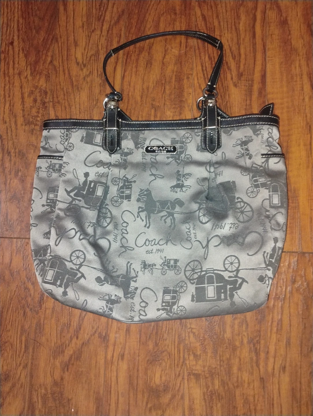 Stylish Coach tote bag with a repeating horse and carriage pattern. Features a fabric exterior with leather trim. Perfect for everyday use or a weekend getaway!