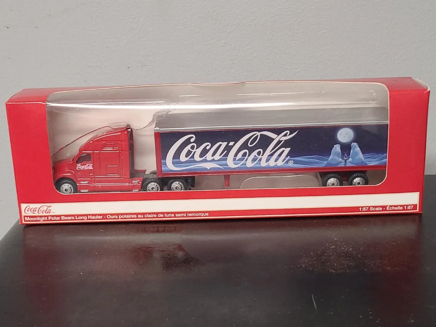 This is a Coca-Cola Moonlight Polar Bears Long Hauler toy truck. It's a 1:87 scale model. The trailer features a winter scene with polar bears under a full moon. This die-cast replica comes in its original packaging.