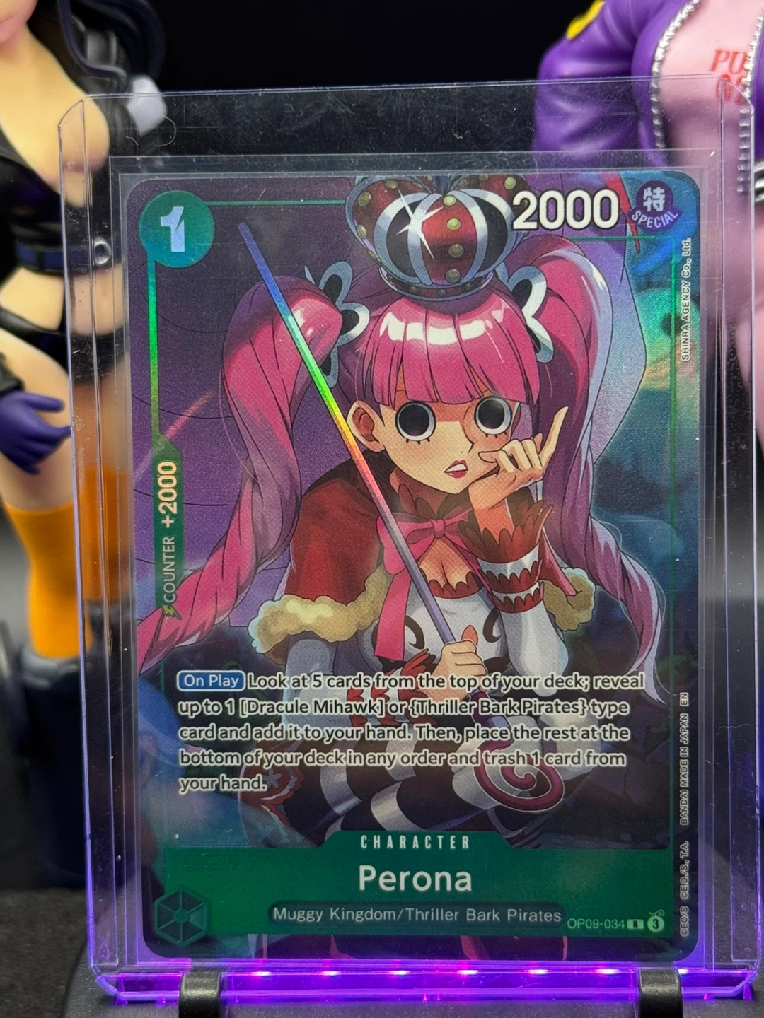This is a Perona character card from the One Piece Card Game. It's from the Muggy Kingdom/Thriller Bark Pirates set. The card has a power of 2000 and provides a counter bonus of +2000.