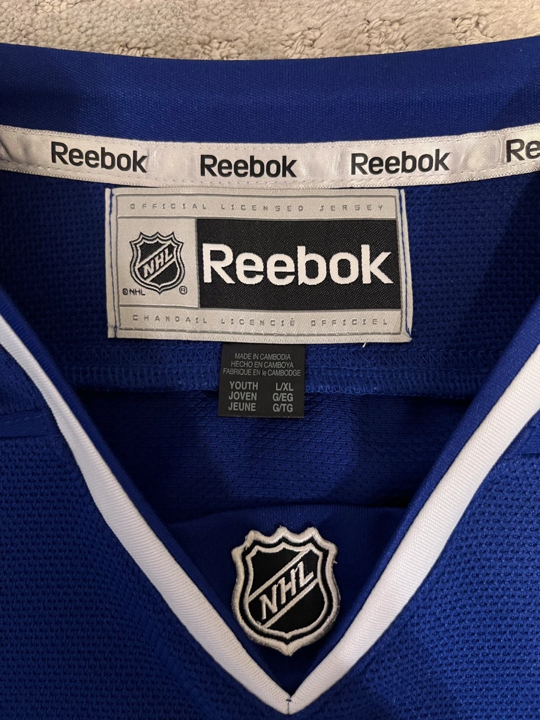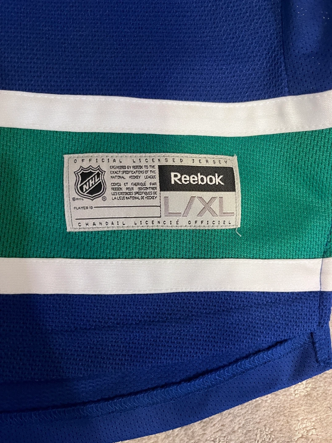 Official licensed NHL jersey by Reebok. Features the Vancouver Canucks design. Made in Cambodia. Size is Youth L/XL.