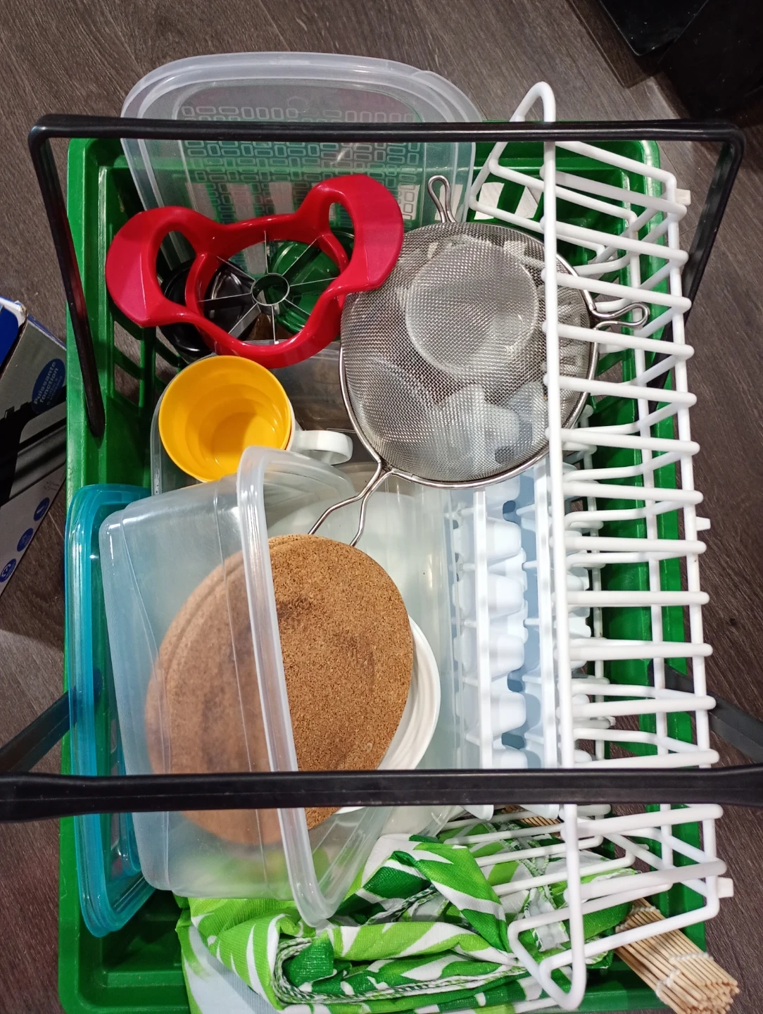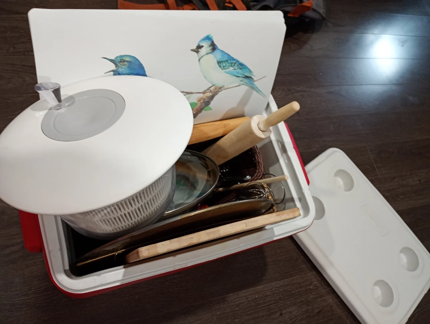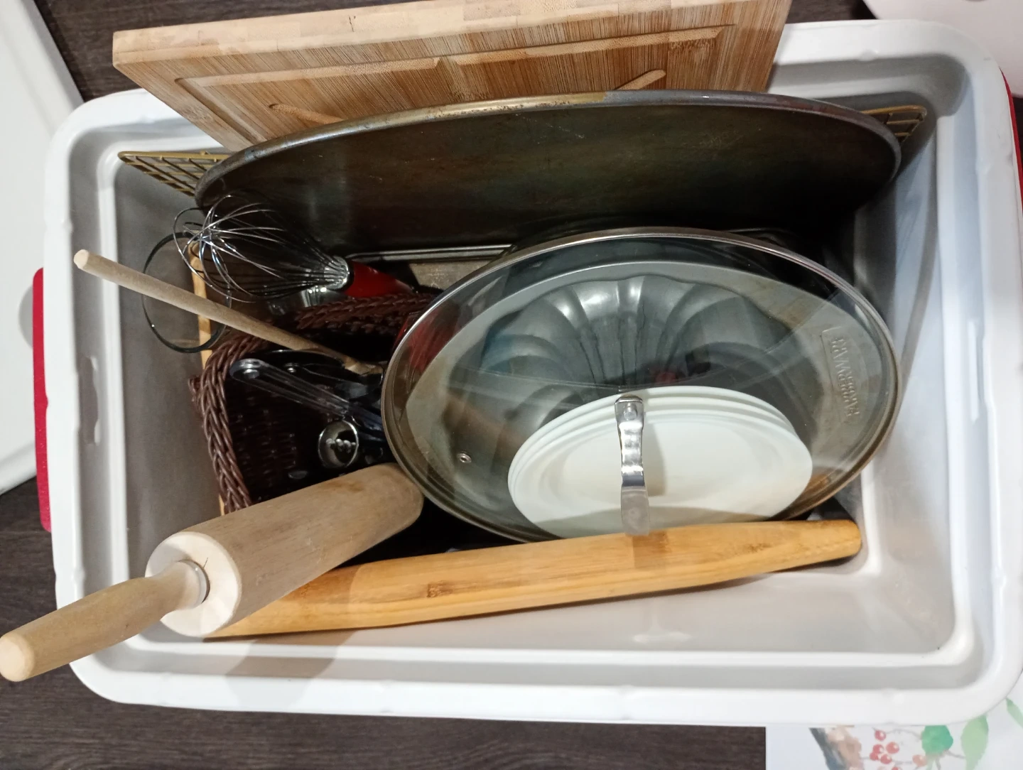 A collection of kitchen tools including a rolling pin, egg whisk, apple slicer, and a salad spinner. Also includes various storage containers and a Bundt pan. Perfect for someone setting up a new kitchen or looking to expand their baking and cooking supplies!