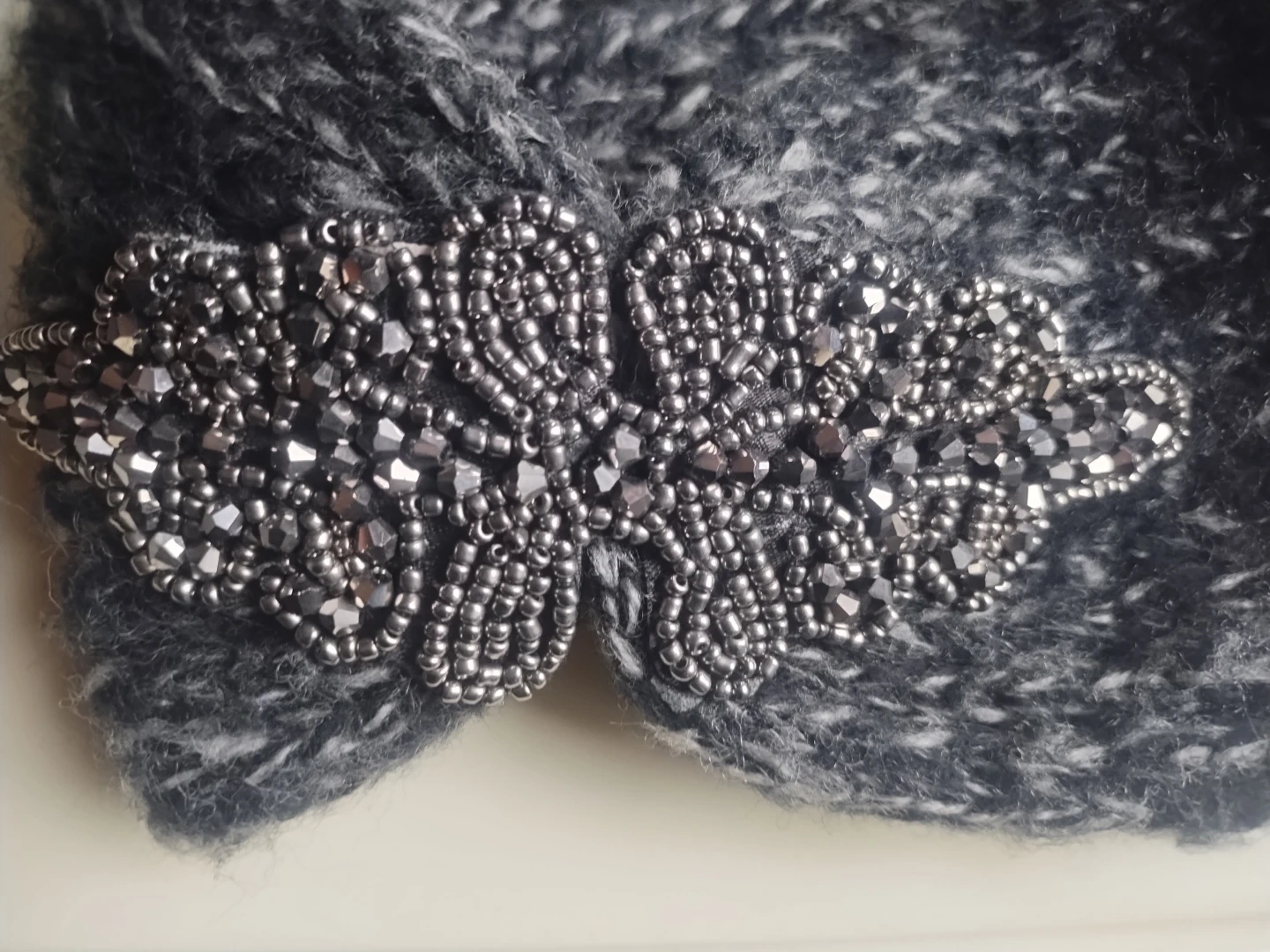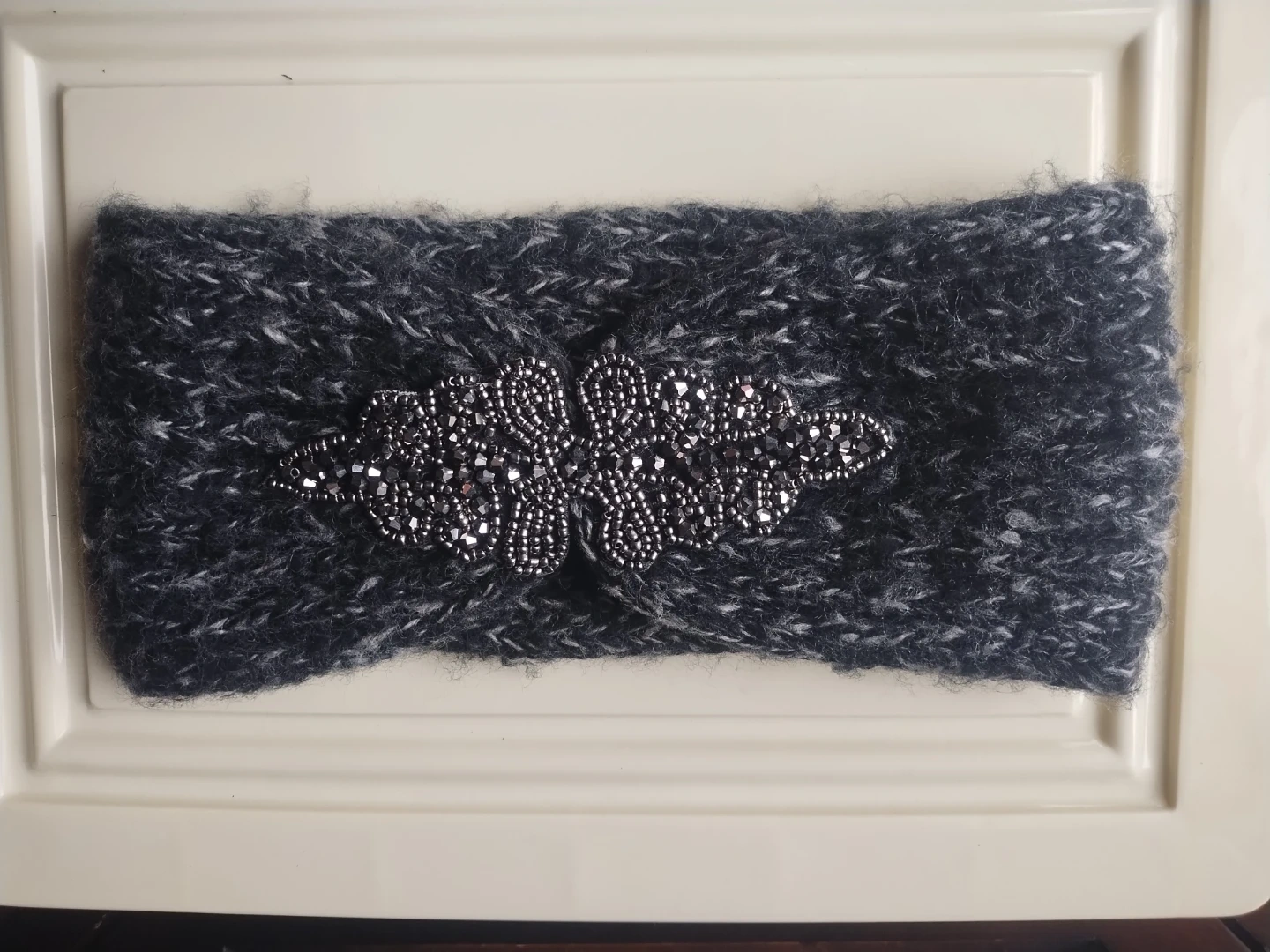 A cozy knitted acrylic headband with stretch, measures 20" x 4". It features a decorative embellishment of beads and crystals. Excellent, clean condition.