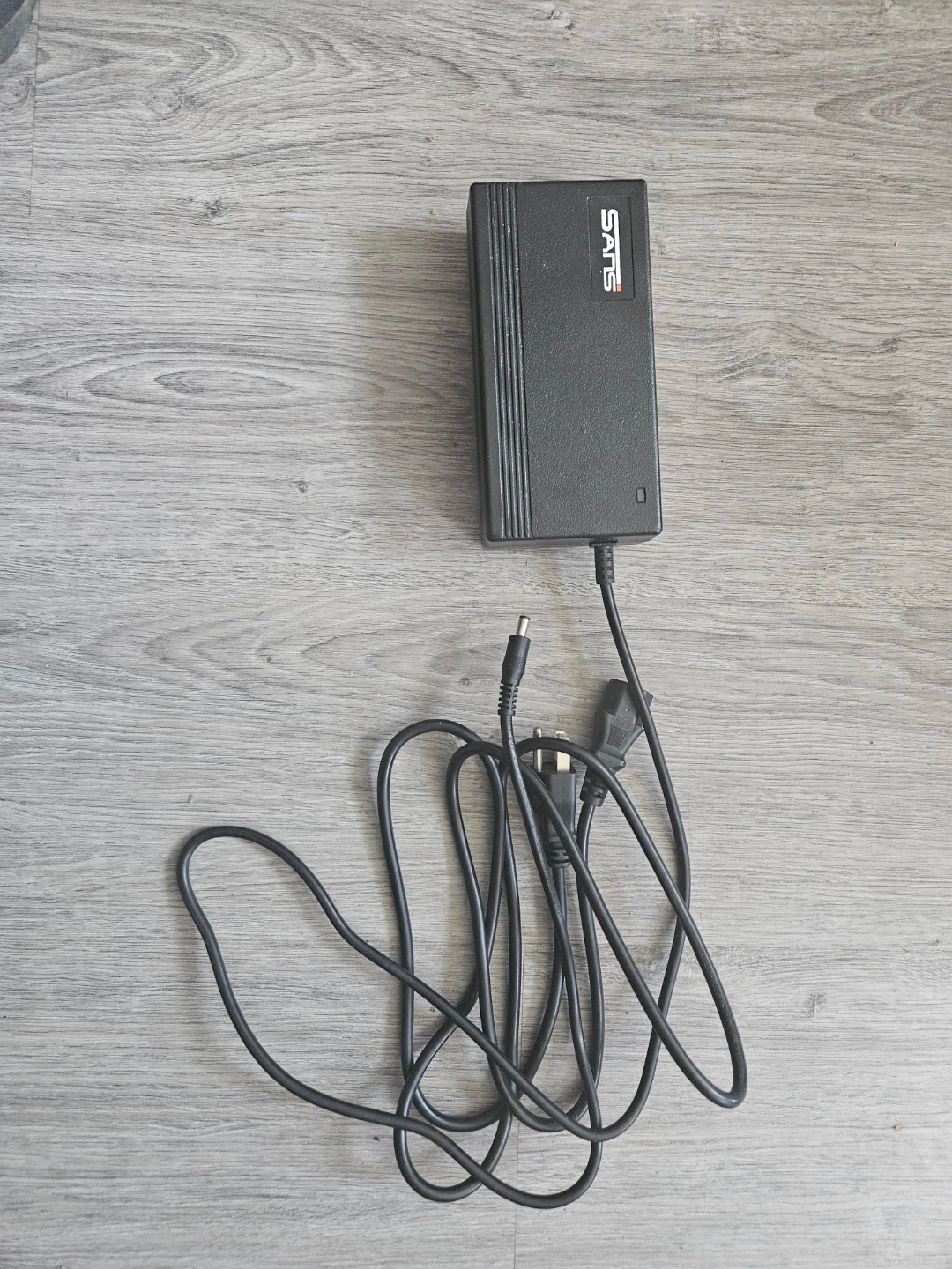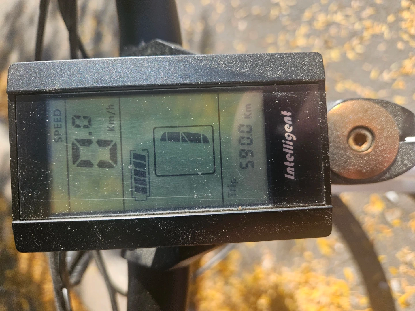 White electric EMMO MONTA. It has a digital display showing speed and trip distance. Includes a charger 2 keys and a waterproof cover. Has a 48v 21 ah battery good for about 100 km per charge