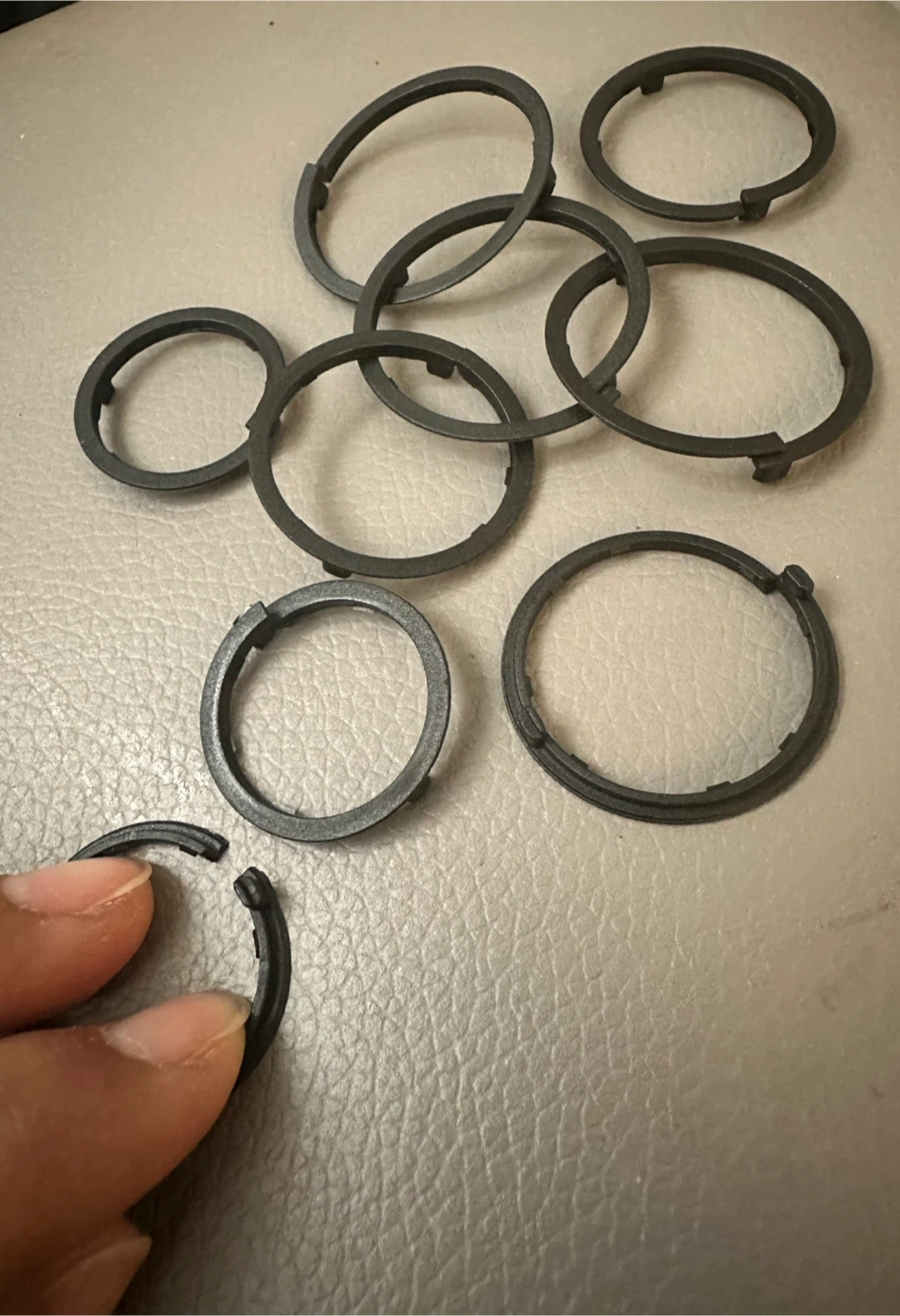 This is a set of seven black plastic clips / rings or Push-On Fasteners. They are circular with a notched design on the inner edge. These are useful for various DIY or repair projects.