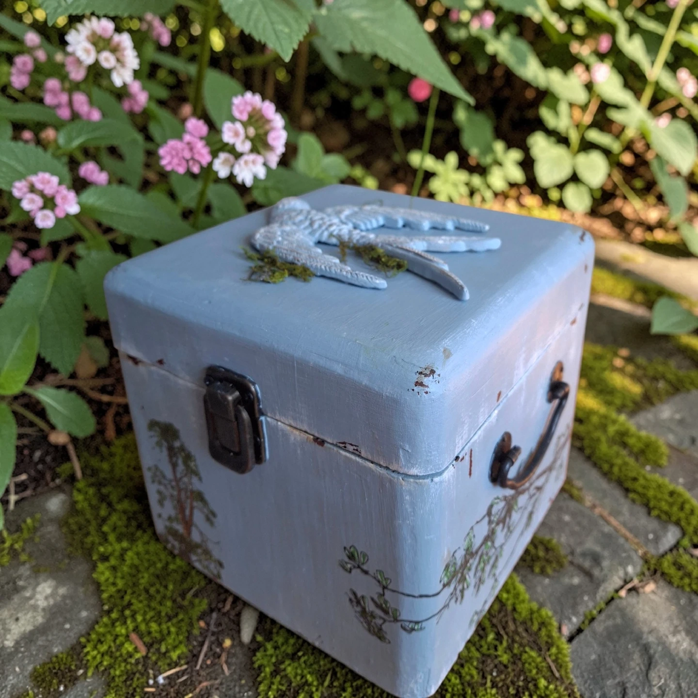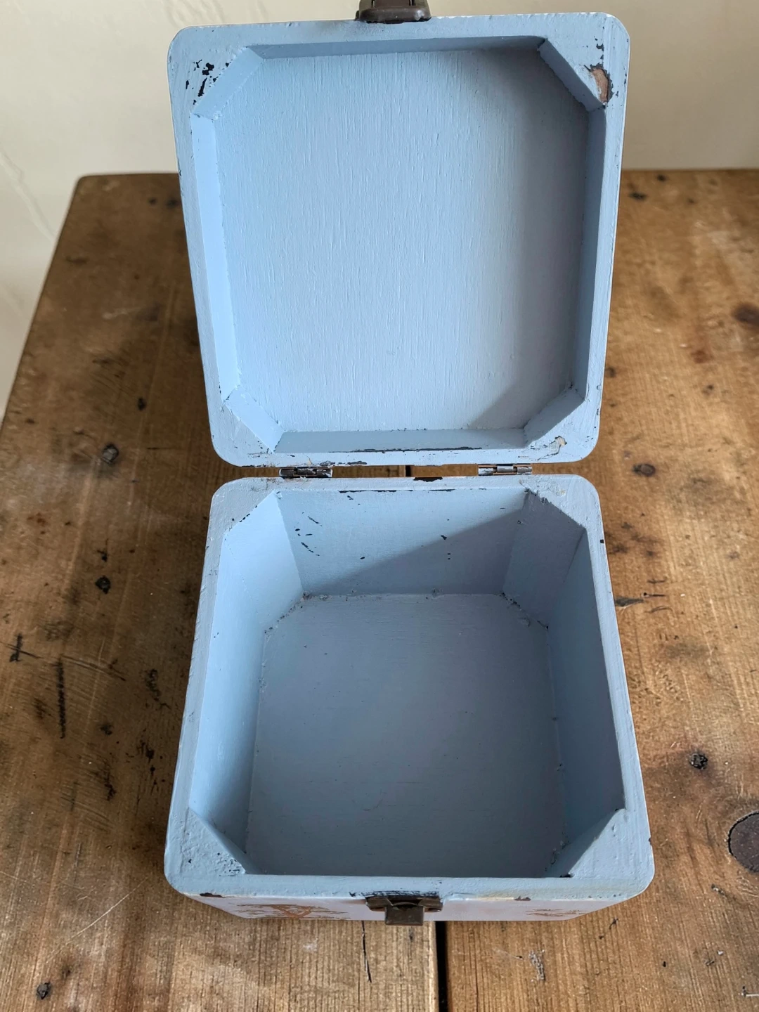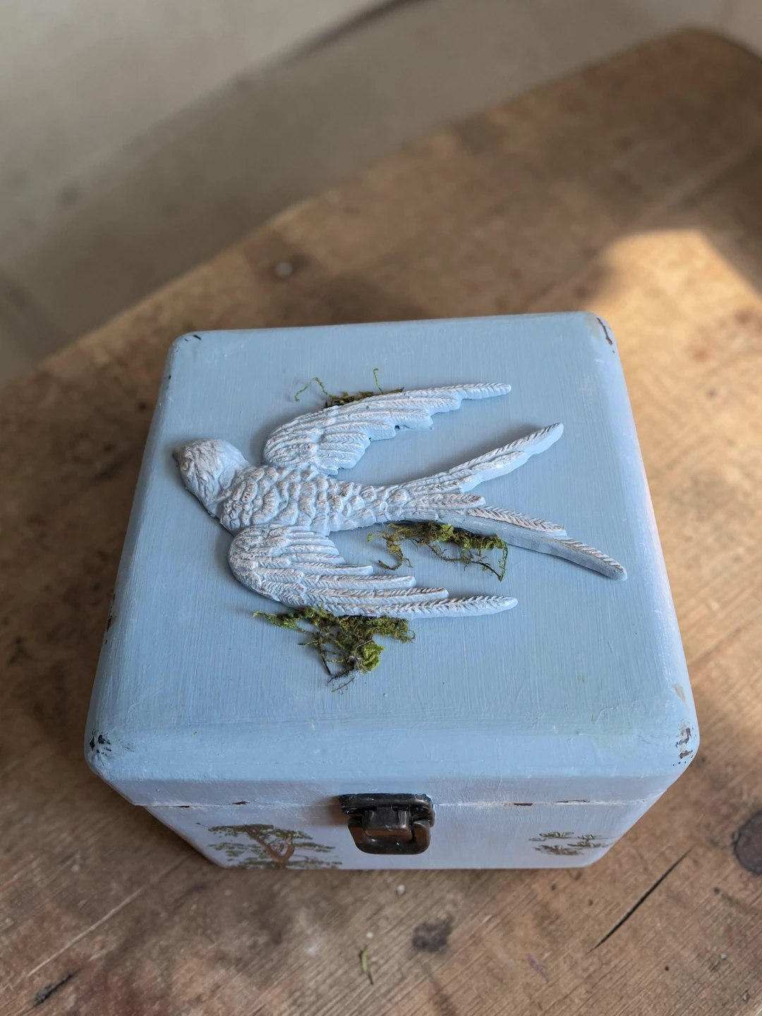 This charming decorative box is painted a soft blue and features a lovely bird relief on the lid. It's a great little container for trinkets or jewellery. The inside is also painted blue.