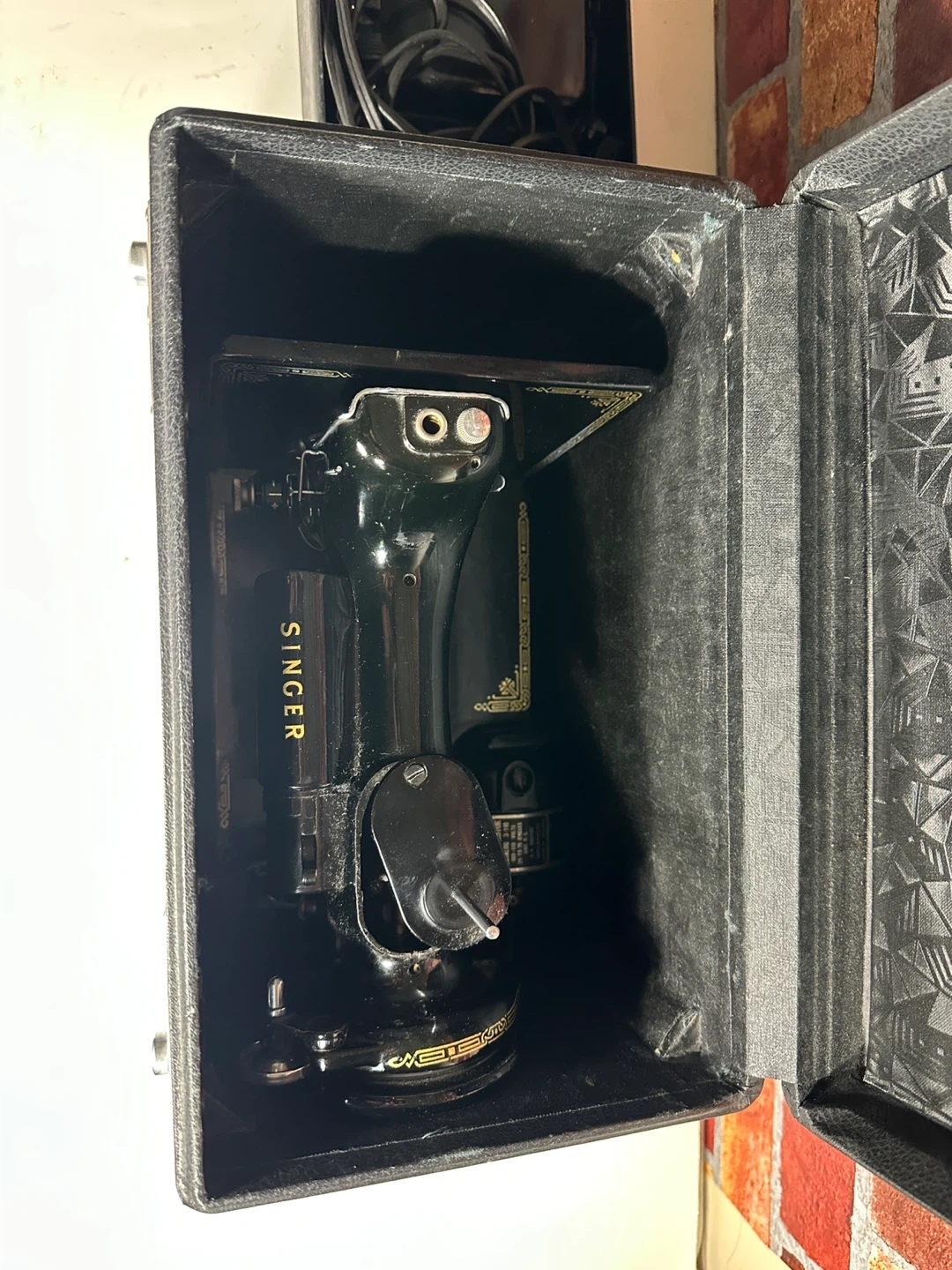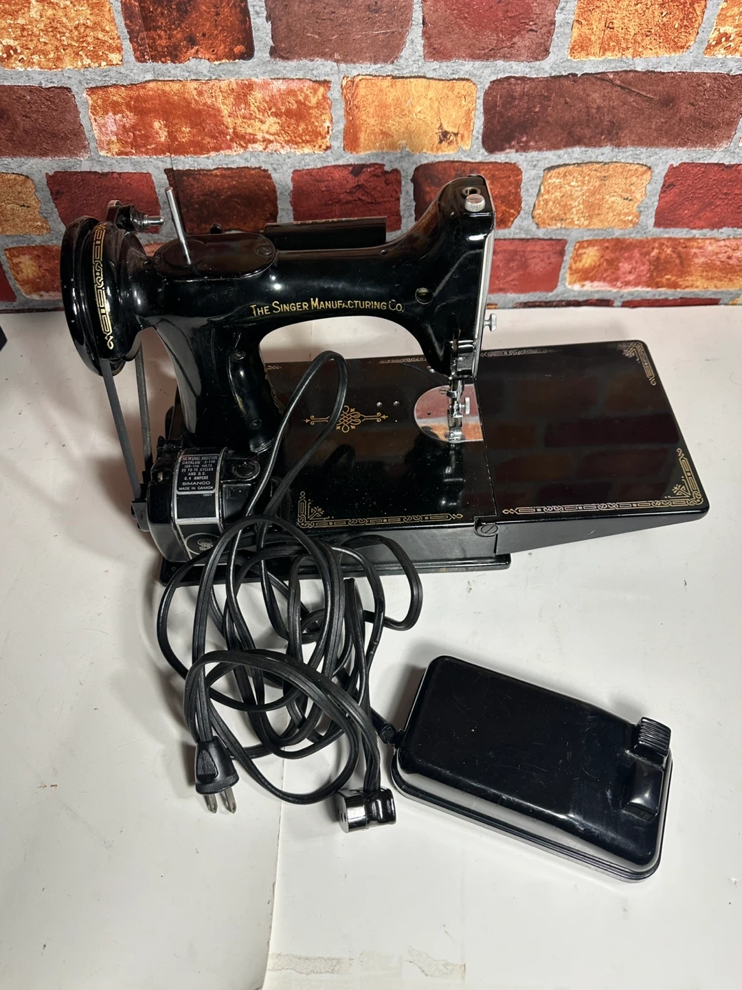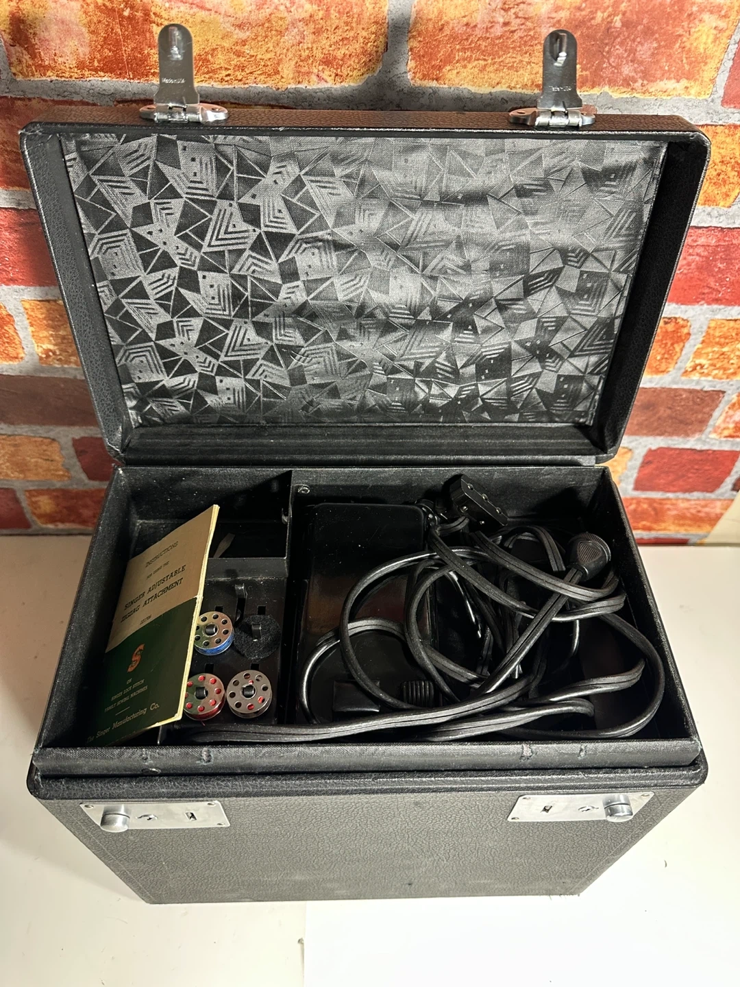 Vintage black Singer sewing machine, includes carrying case and accessories. Comes with manual, bobbins, and power cord. It's a classic piece for any sewing enthusiast!