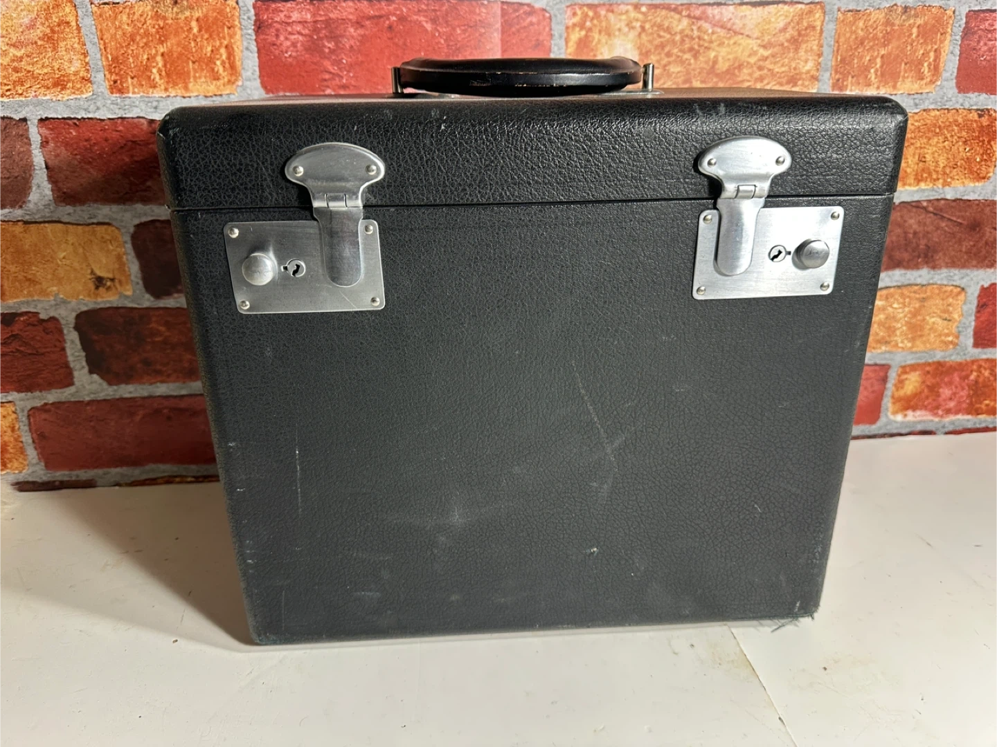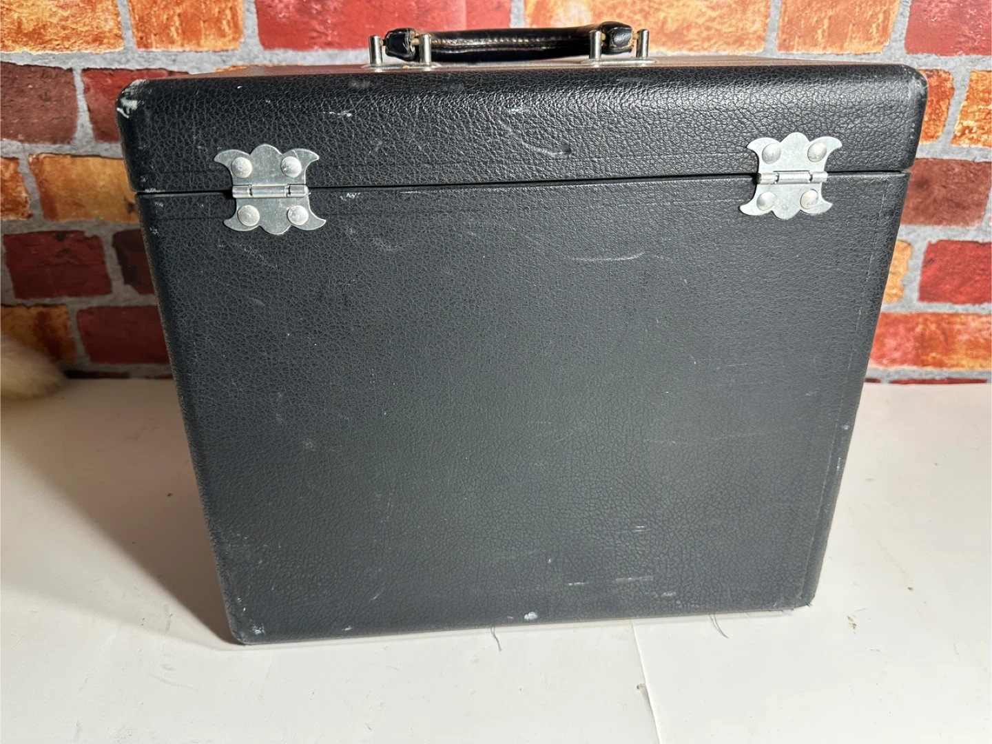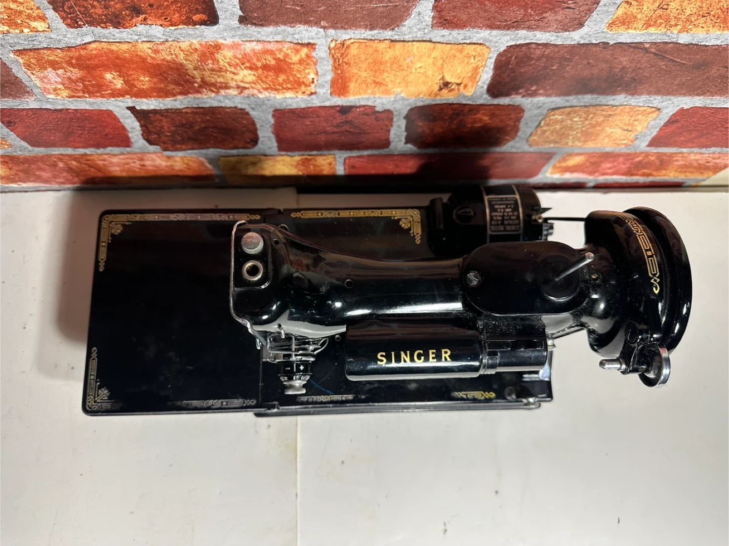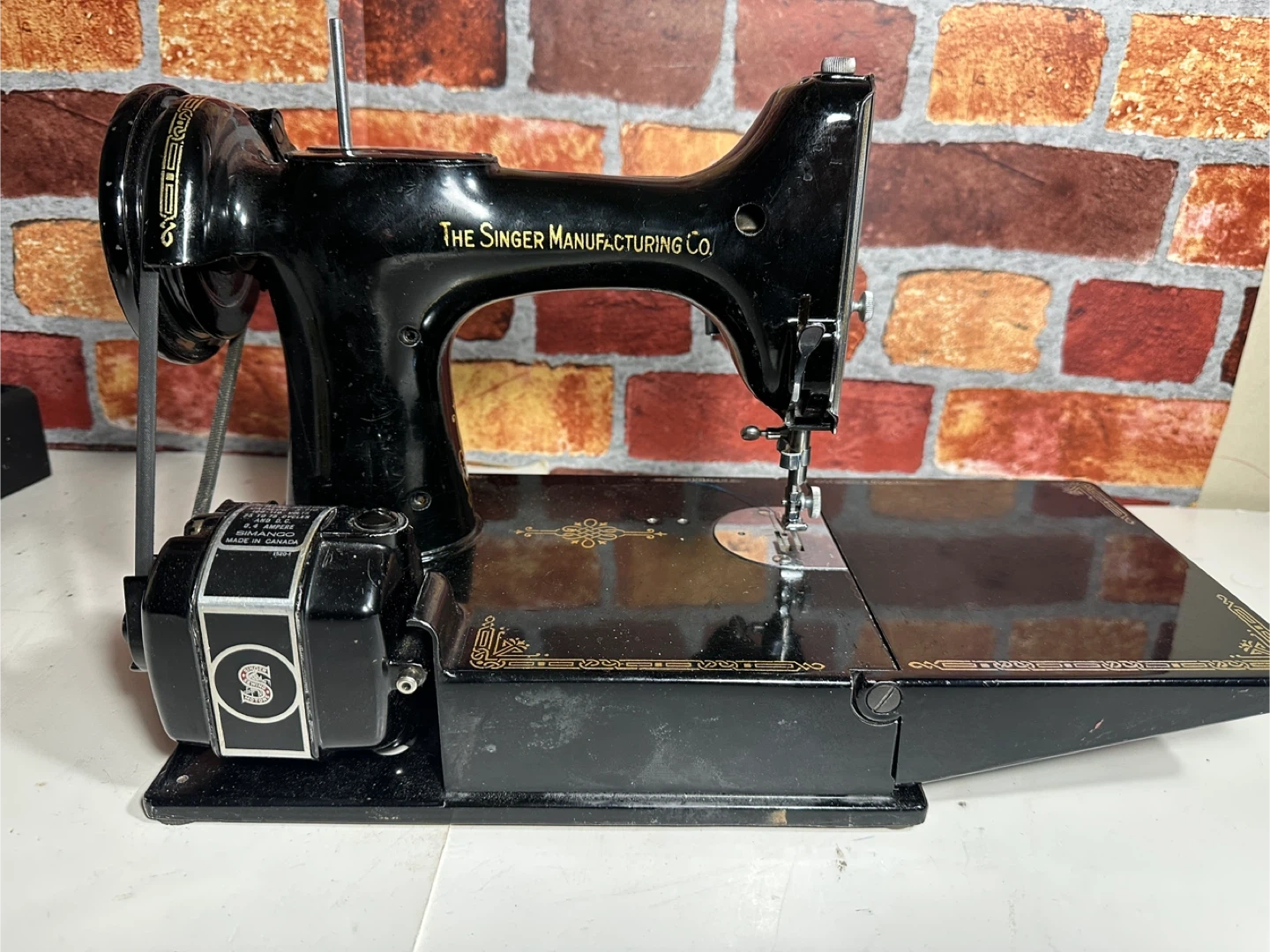 Vintage black Singer sewing machine, includes carrying case and accessories. Comes with manual, bobbins, and power cord. It's a classic piece for any sewing enthusiast!