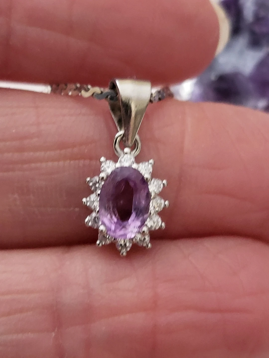 Sterling silver pendant necklace featuring an oval amethyst surrounded by small cubic zirconia stones. The chain is a delicate sterling silver stamped 925.