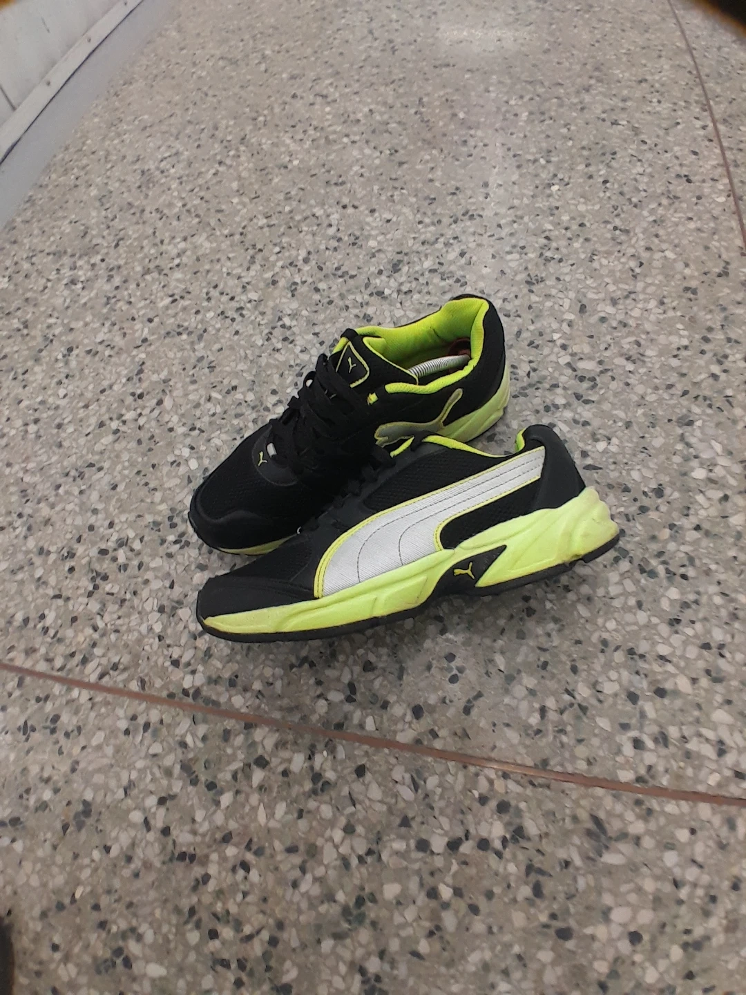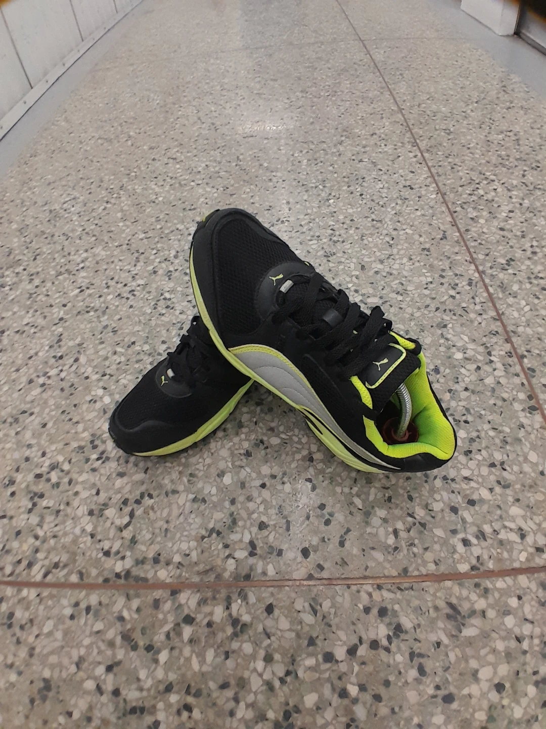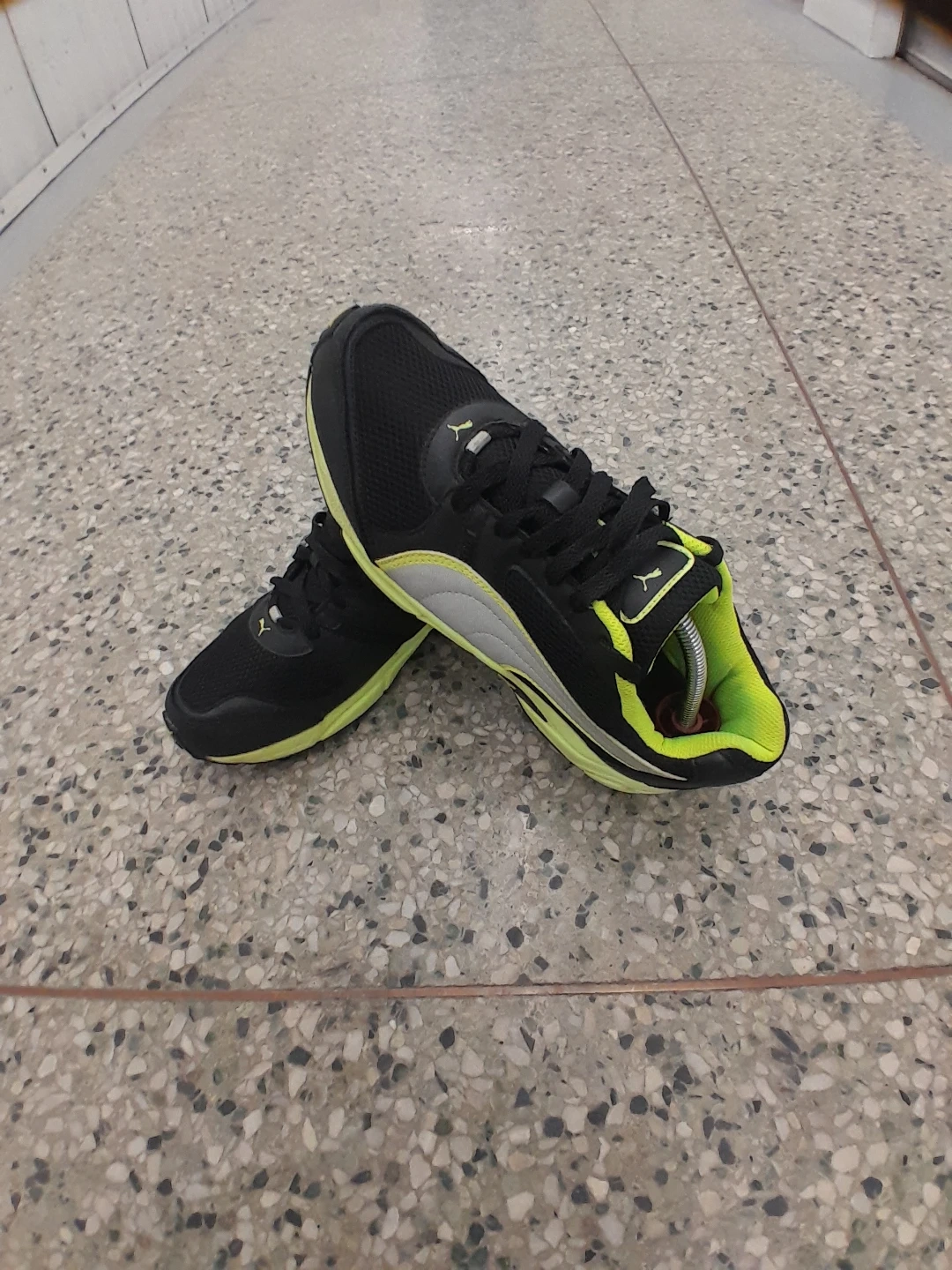 Puma running shoes in black with neon accents. Features a breathable mesh upper and cushioned sole for comfort. Great for workouts or casual wear! Men's Size 8.5