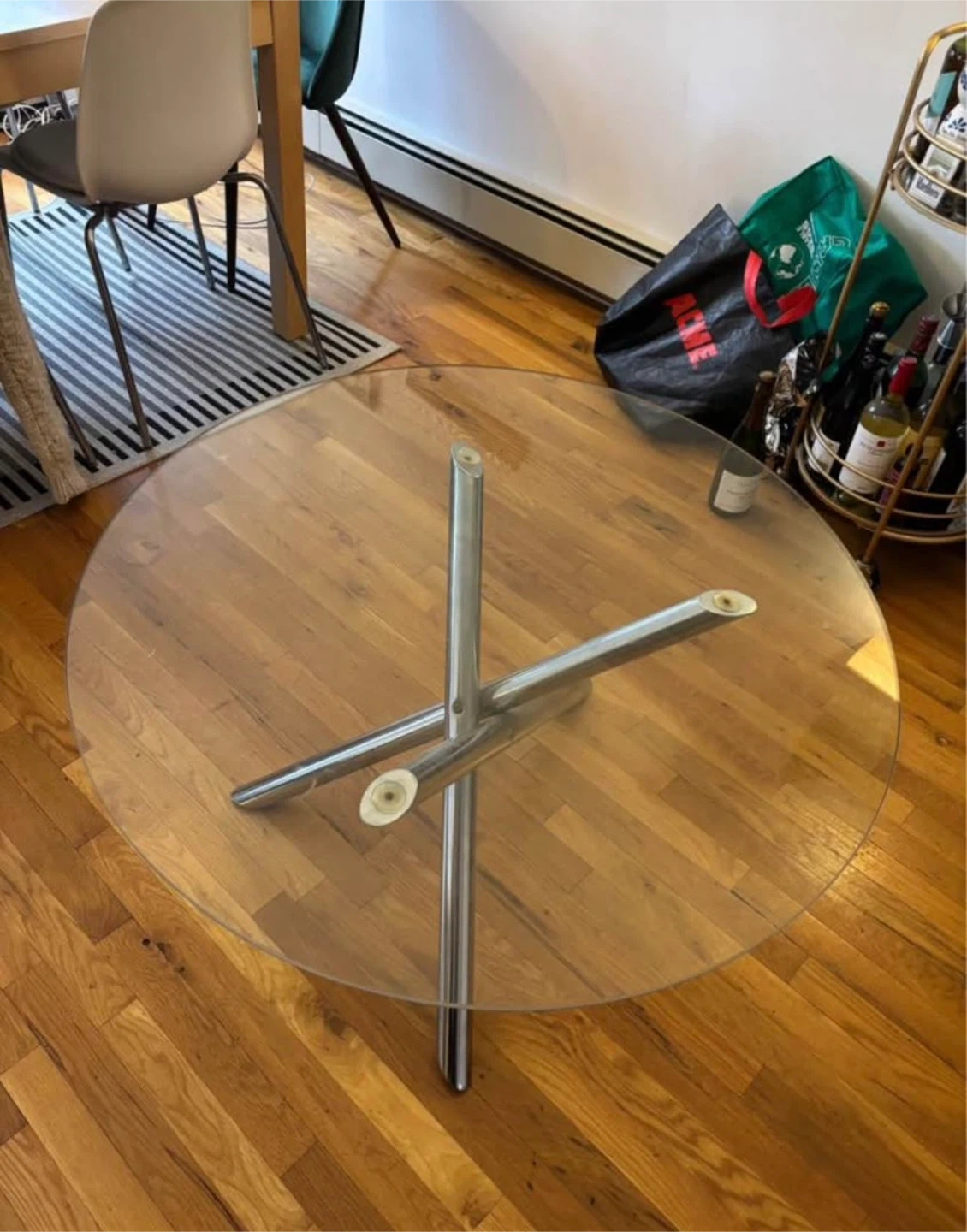 Selling a glass top coffee table with a unique chrome base. It's in great condition and would be a stylish addition to any living room! The glass is clear and the chrome is shiny, making it a real eye-catcher
