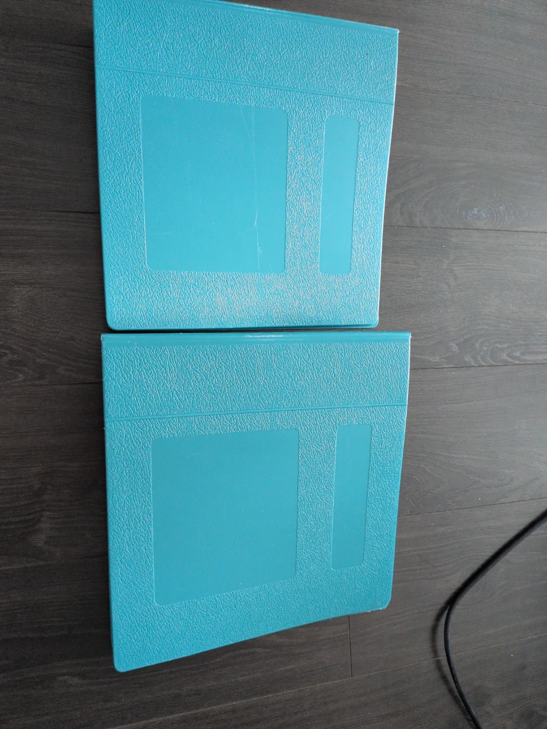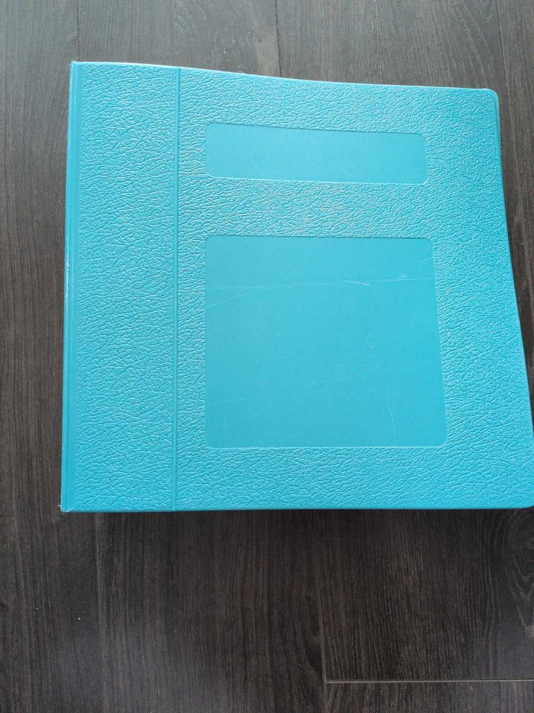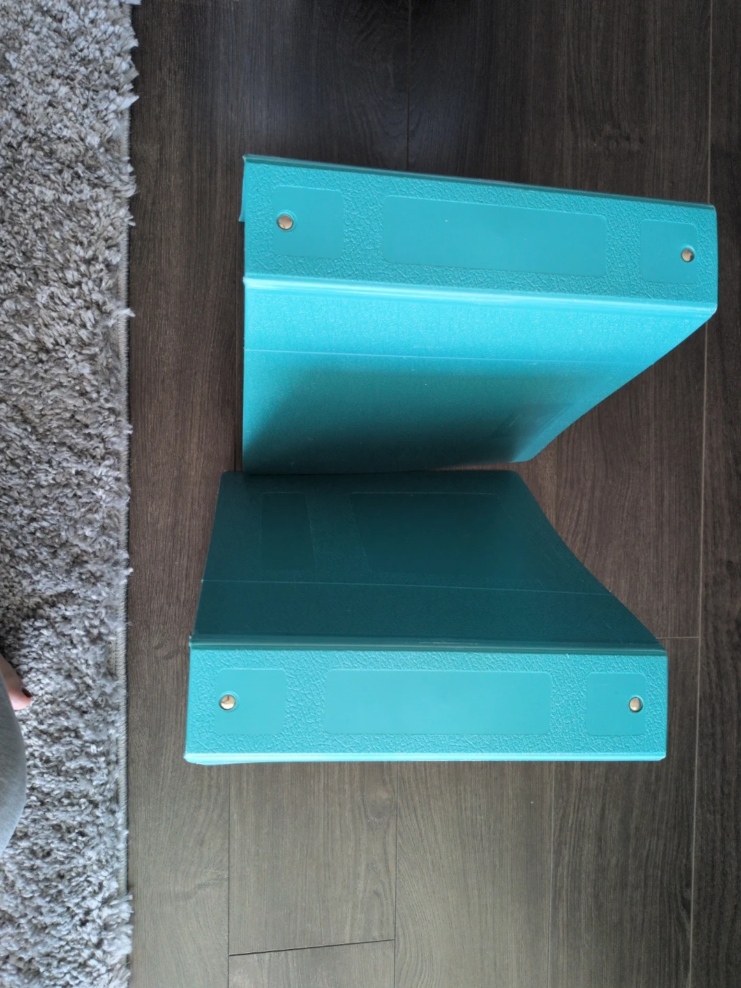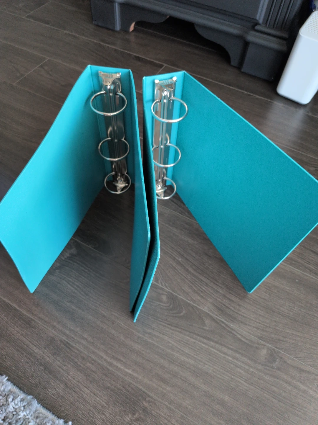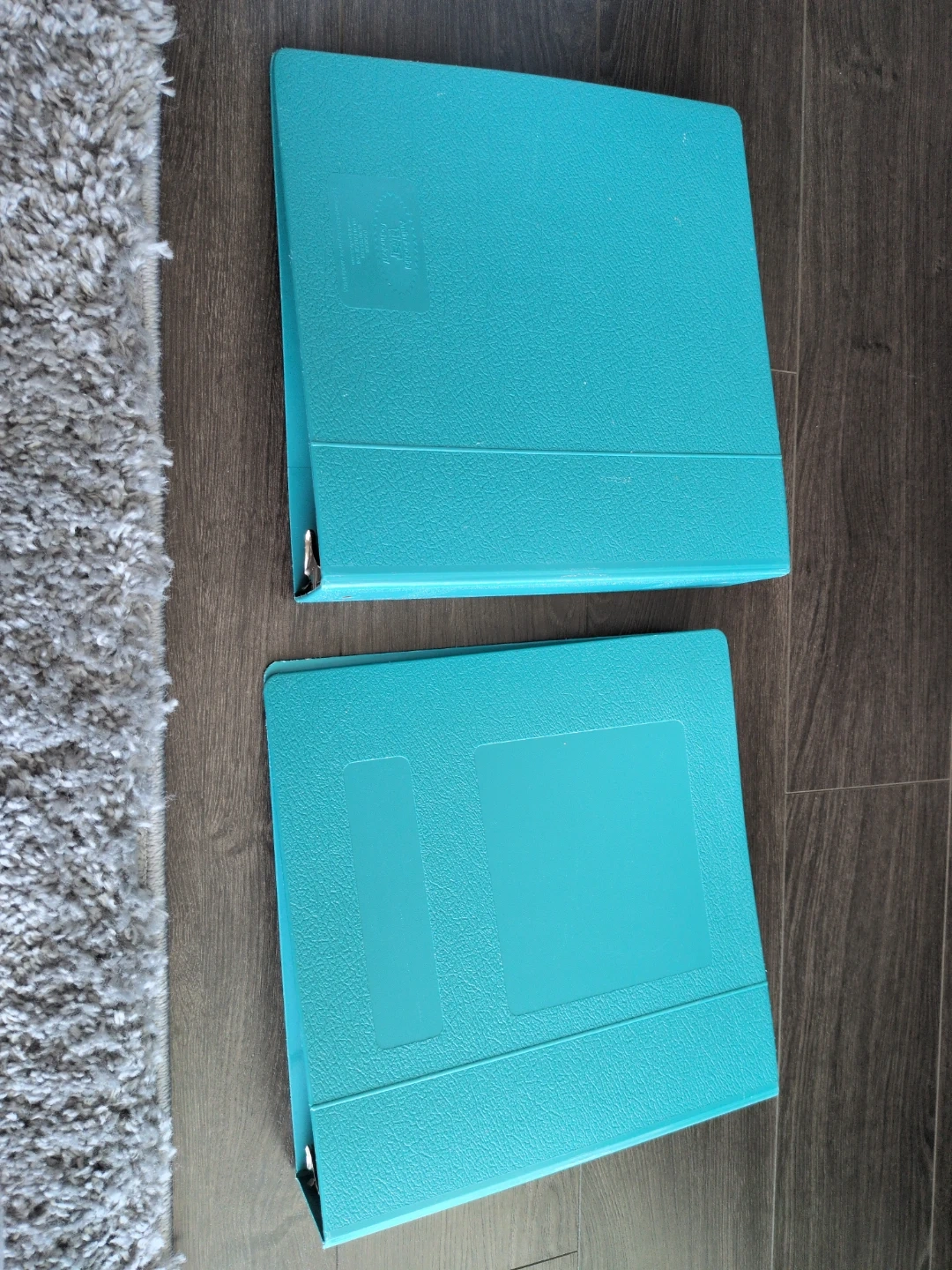 Two aqua blue binders are available. They have a textured exterior and feature clear sleeves on the front and back cover for customization. The metal rings are shiny and secure. $30 for both.