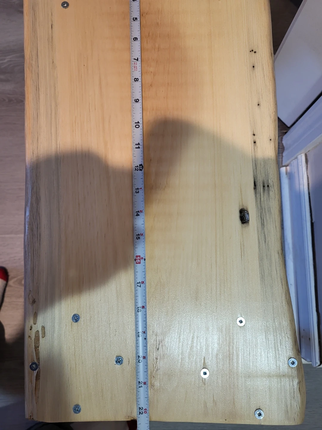 Here's a cute little handmade wooden plant stand! The top is a light wood, and the legs are black. It's about 22 inches long, 11 inches wide, and stands about 16 inches tall. Perfect as a small side table.