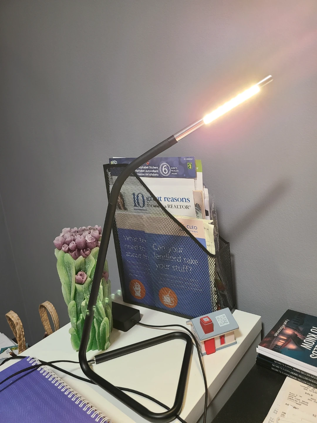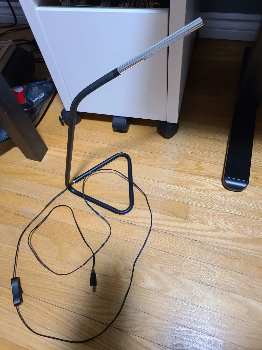 Selling a sleek black LED desk lamp. It's in great shape and perfect for a desk or bedside table. It has a flexible neck so you can adjust the light where you need it. It also has a USB power cable and a switch on the cord