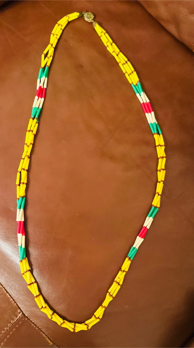 This necklace features multiple strands of yellow tube beads with smaller brown beads in between. Sections of white, red, and green beads add color. It has a decorative clasp. Approximately 17 inches long when laid flat.