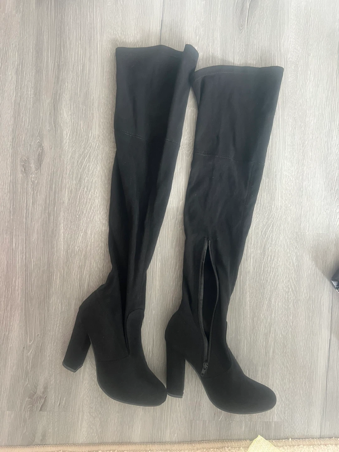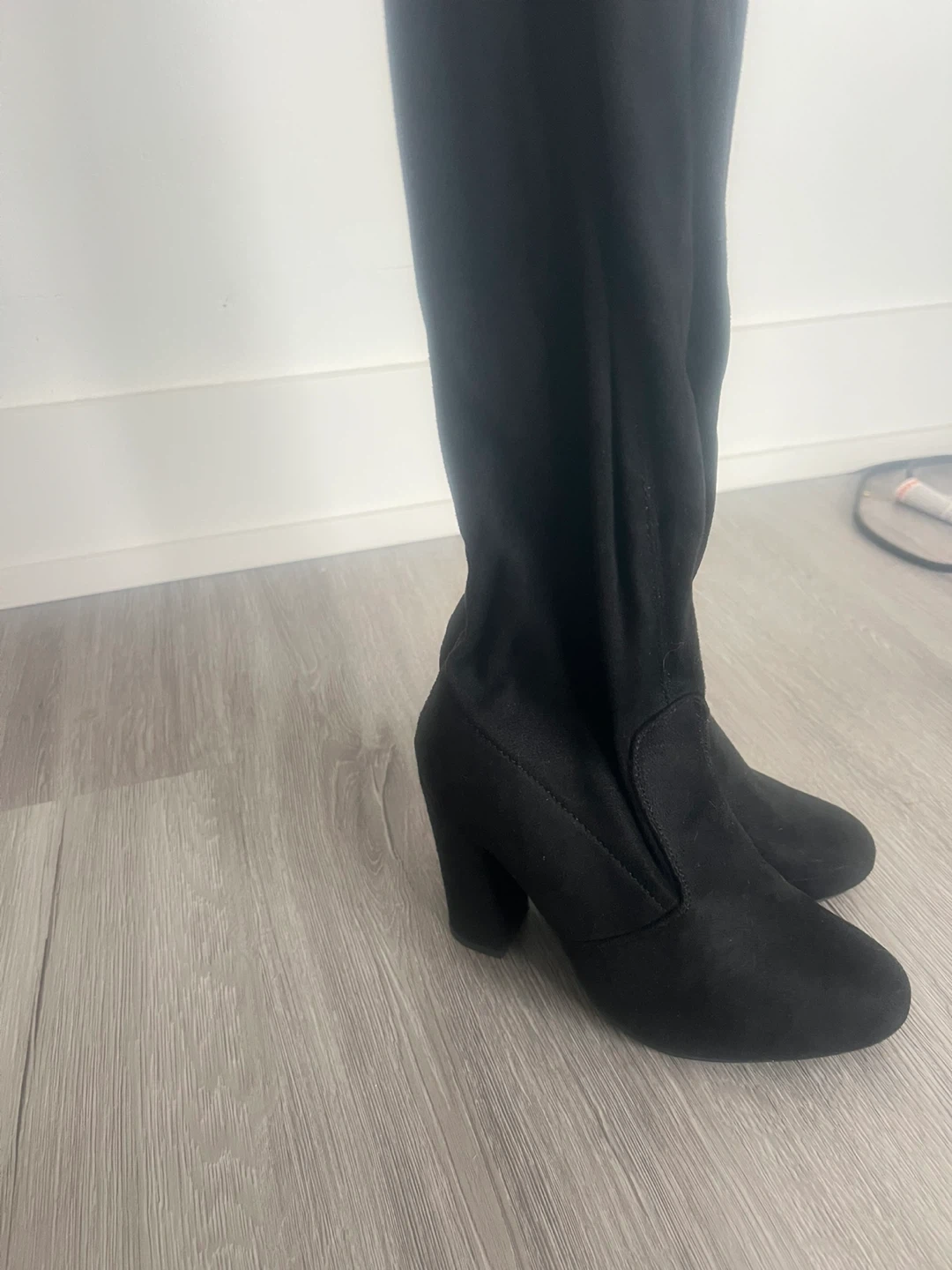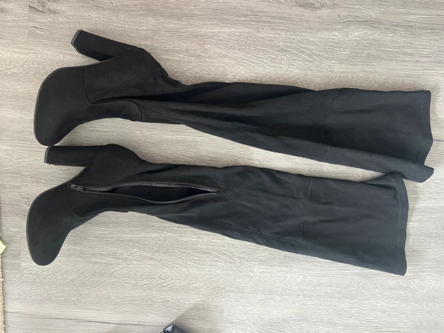 These black over-the-knee boots feature a comfortable block heel and a side zipper for easy on and off. They're made from a soft, stretchy material that hugs the leg. Perfect for elevating any outfit!