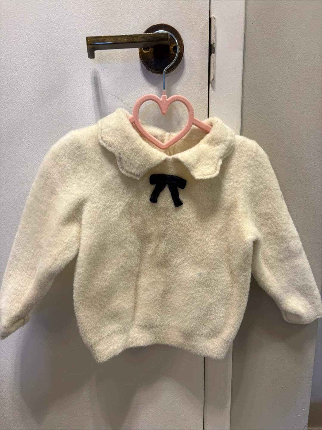 This cream fuzzy sweater is from Dave & Bella. It's made of 100% polyamide and features a cute black bow detail on the front. Perfect for keeping little ones warm and stylish!
