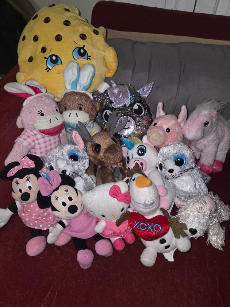 A collection of plush toys including Hello Kitty, Minnie Mouse, and various other characters. Most appear to be small to medium in size. Great for kids' bedrooms or as cuddle companions!
