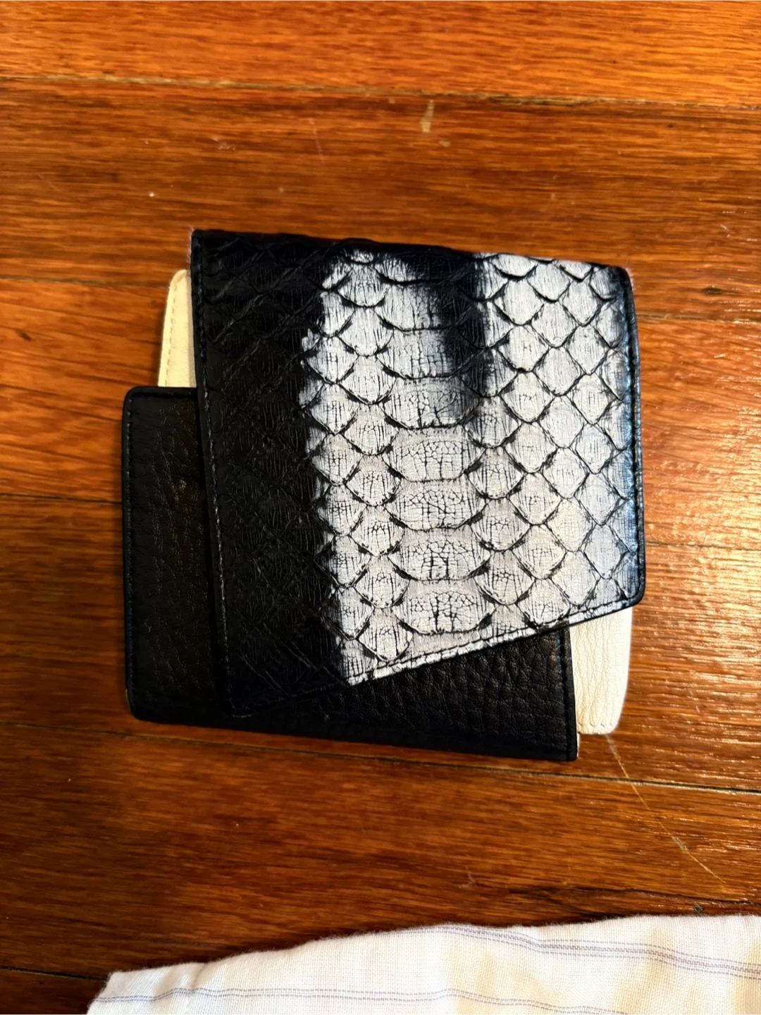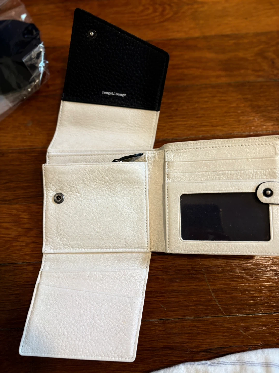 This is a bi-fold wallet from Rouge & Lounge. It's black and white with a textured exterior and multiple card slots inside. Includes an ID window.