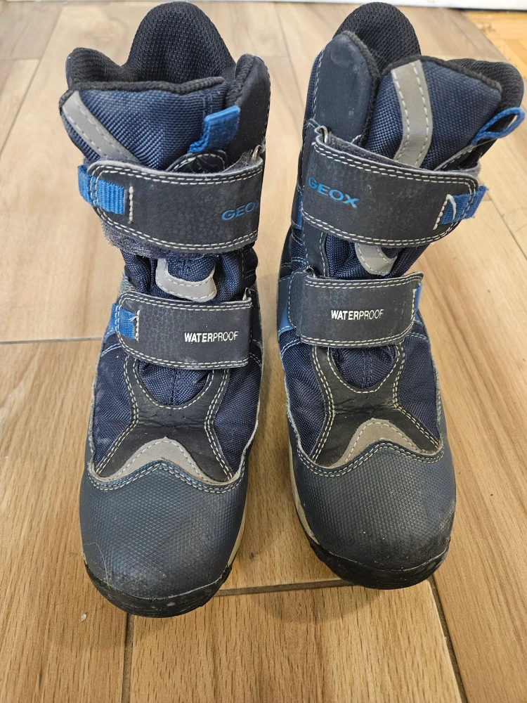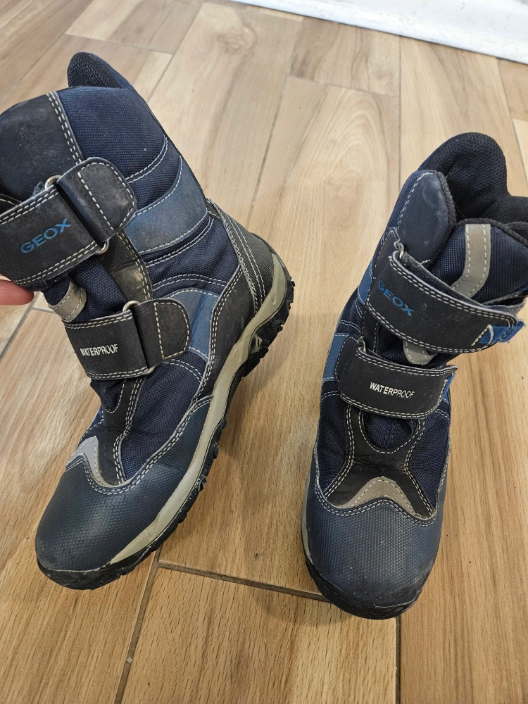 Pair of used children's waterproof winter boots. Dark blue with grey and light blue accents. Velcro closures. Good for snow and cold weather.