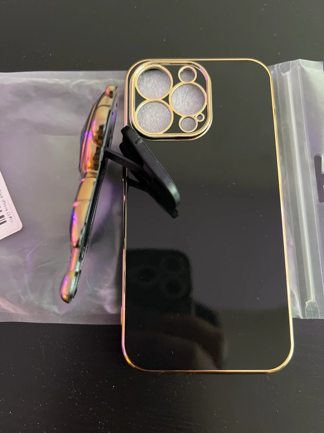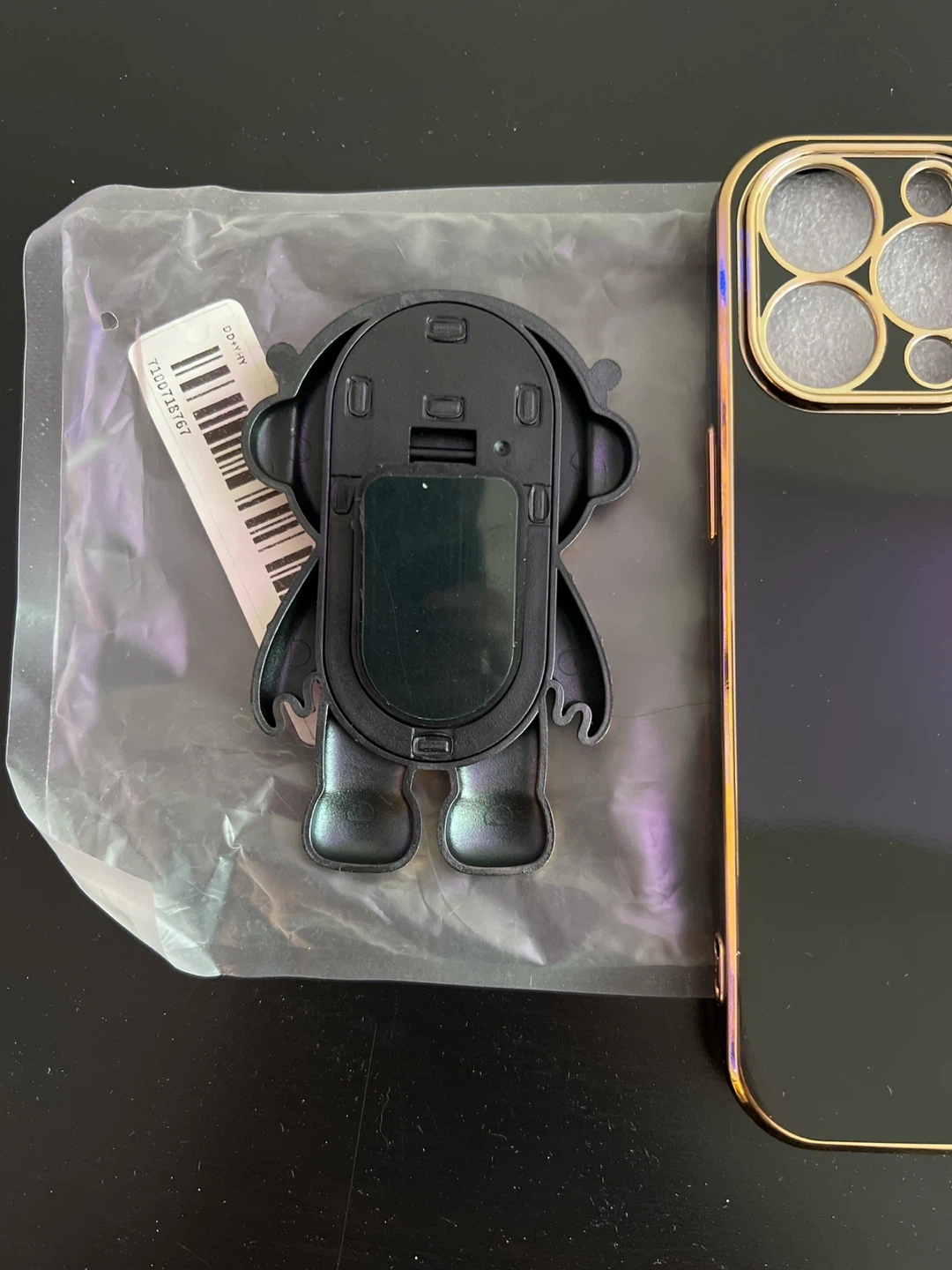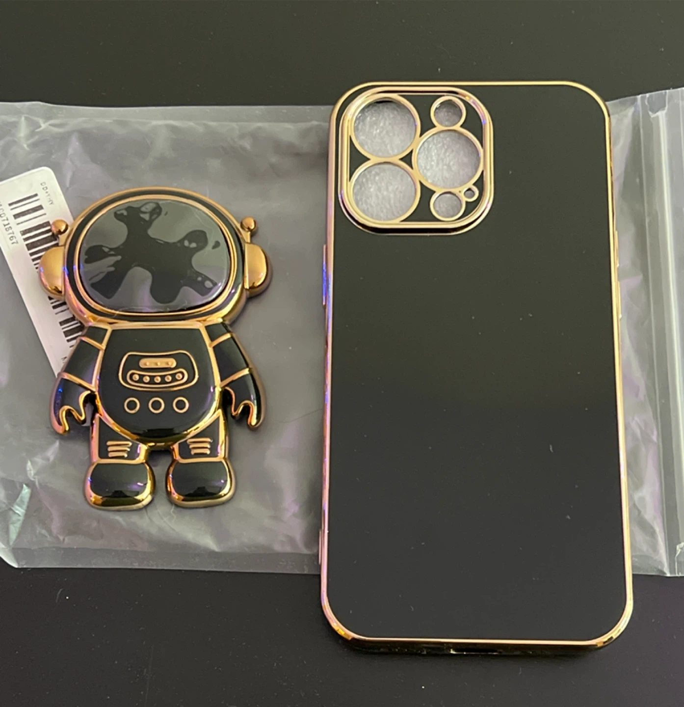 Itβs a black case with gold trim. It includes a matching black and gold astronaut pop socket. There adhesive behind the socket which allows you to customize the position. The socket also pops out to turn into a phone stand.