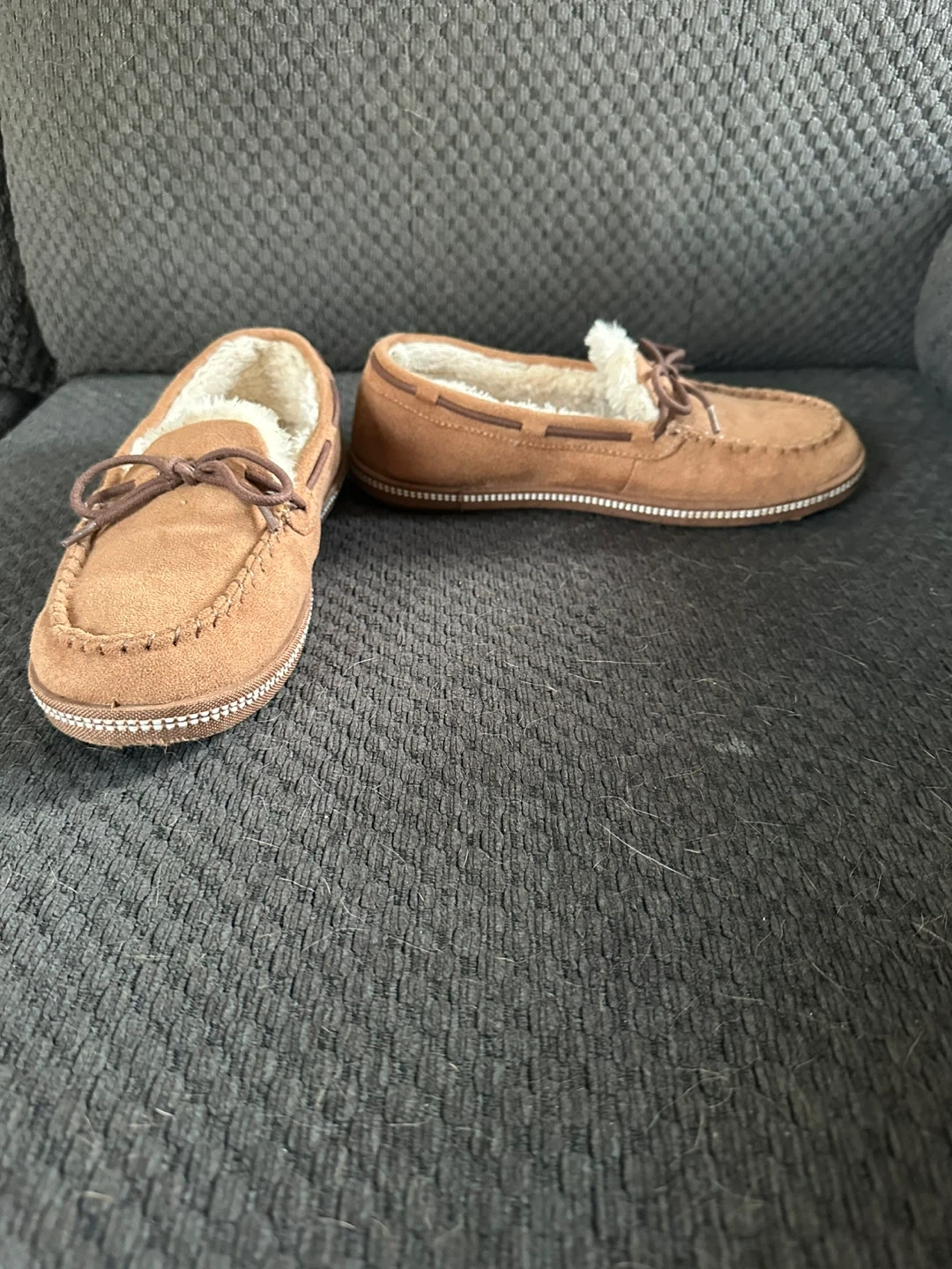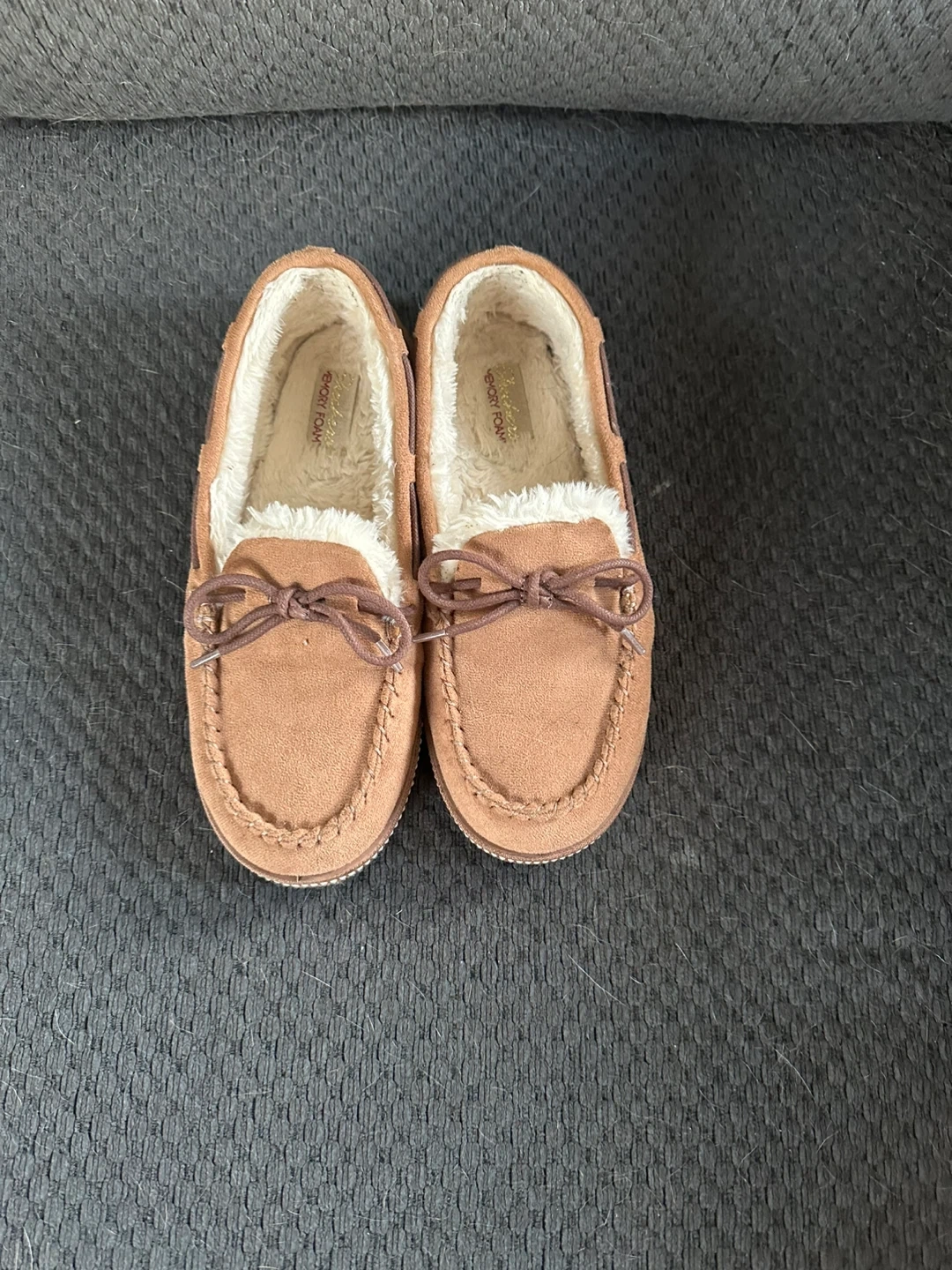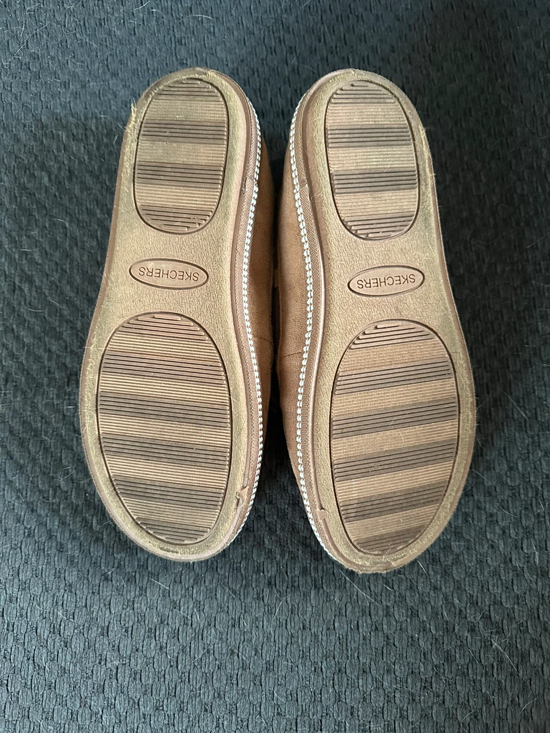Cozy Skechers moccasin slippers for women in a warm brown hue. They're lined with soft faux fur for ultimate comfort. These slippers are perfect for keeping your feet warm around the house.