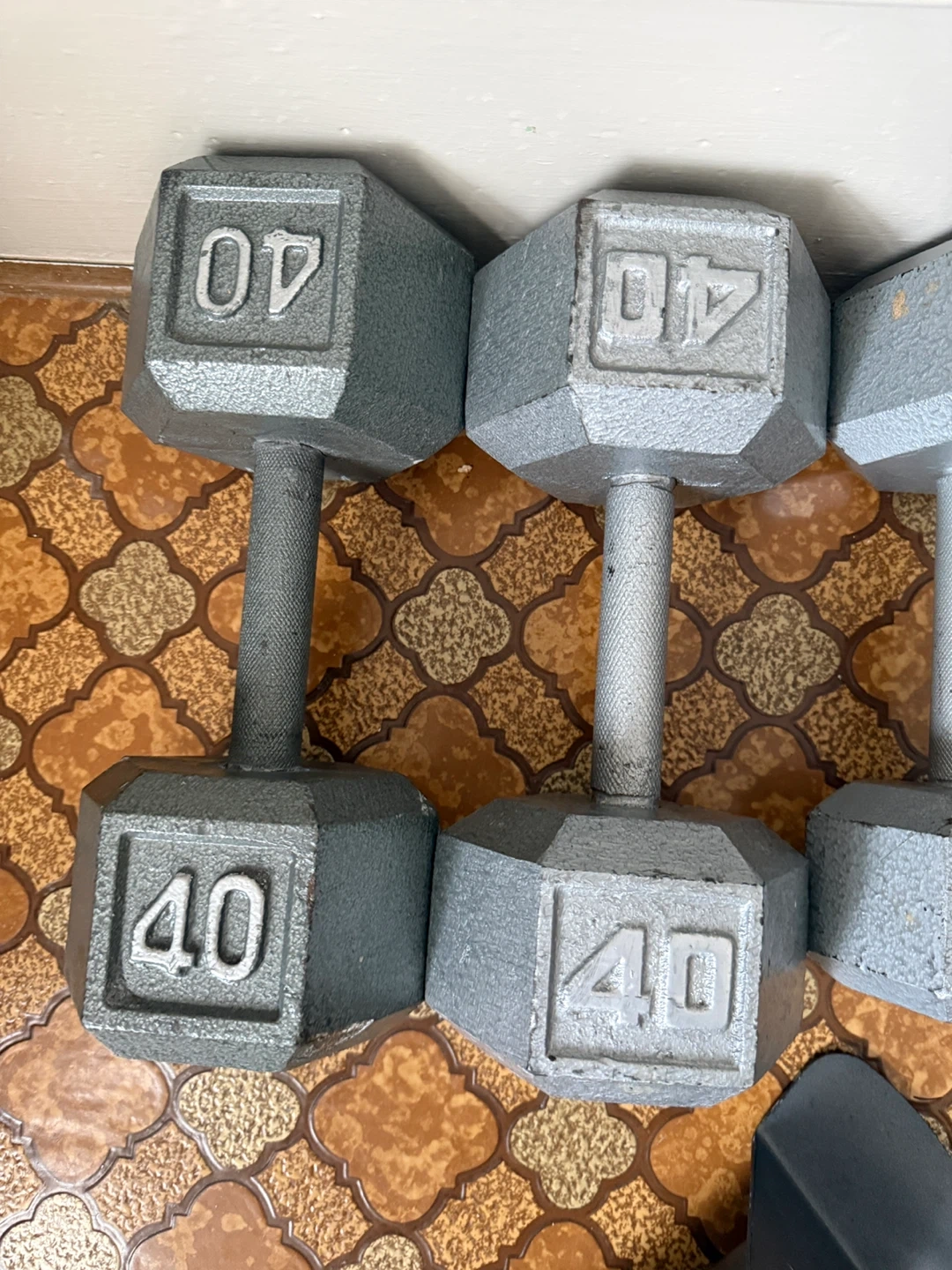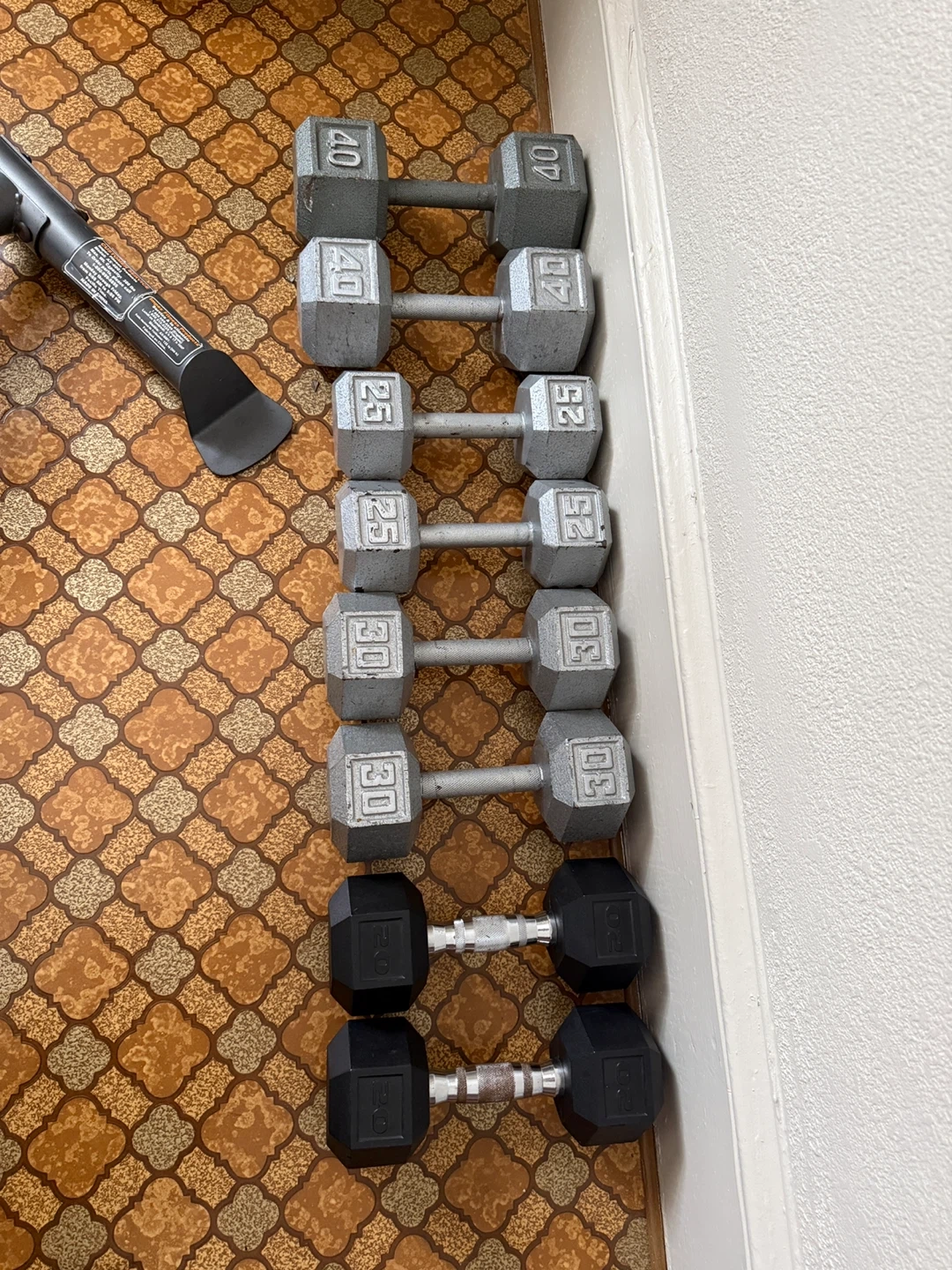 A collection of hex dumbbells for your home gym. Includes pairs of 20lb, 25lb, 30lb, and 40lb weights. These are great for strength training and cardio workouts!