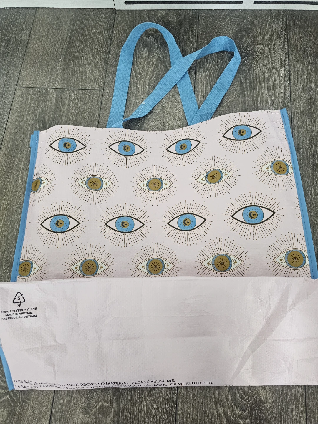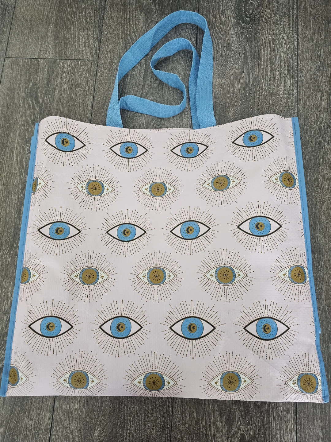 A reusable tote bag featuring a unique evil eye pattern. Made from 100% recycled material. This bag is great for groceries or everyday use!