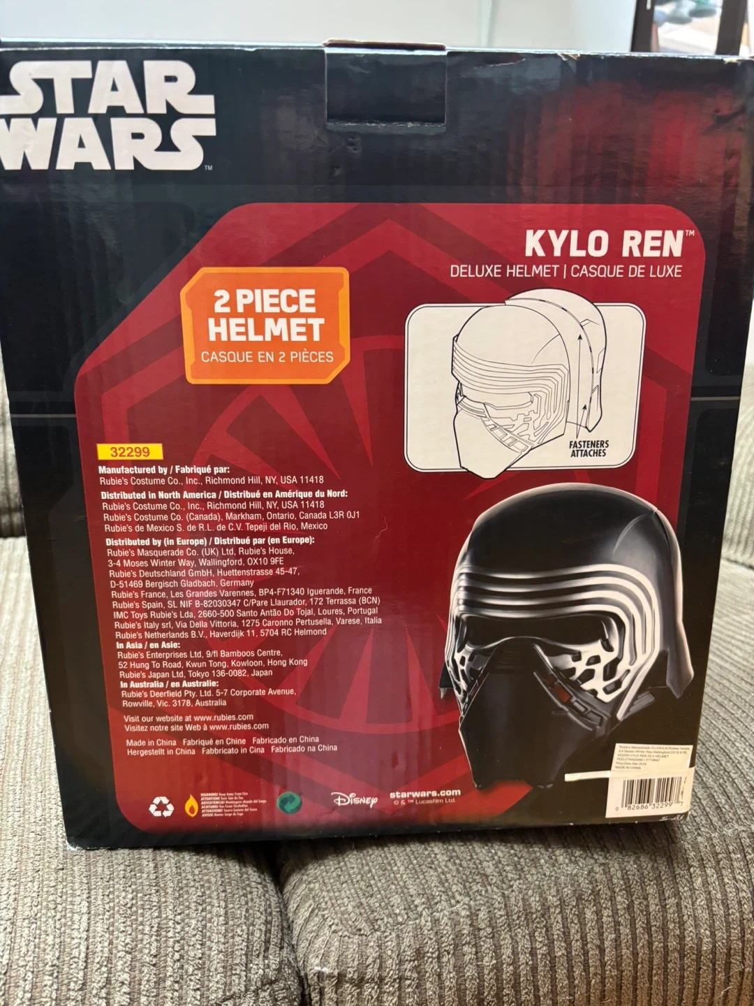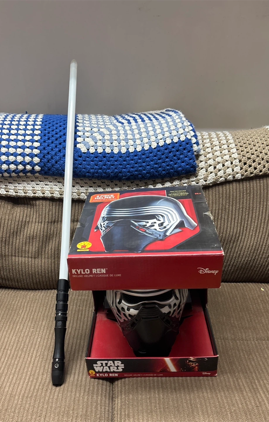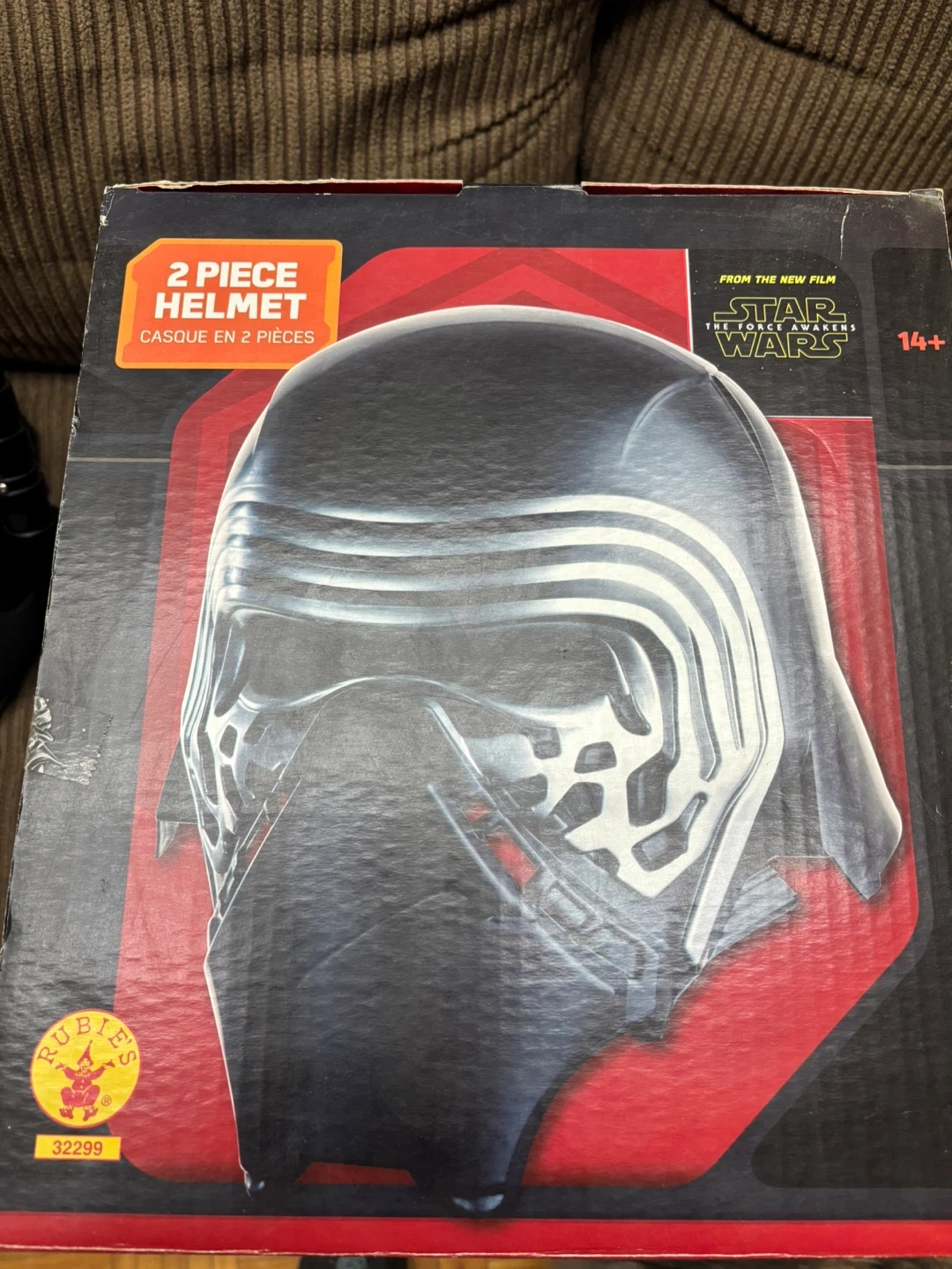 This is a Kylo Ren deluxe helmet from Star Wars, designed in two pieces. It's suitable for ages 14 and up. Comes with the original box. Also comes with a light saber.