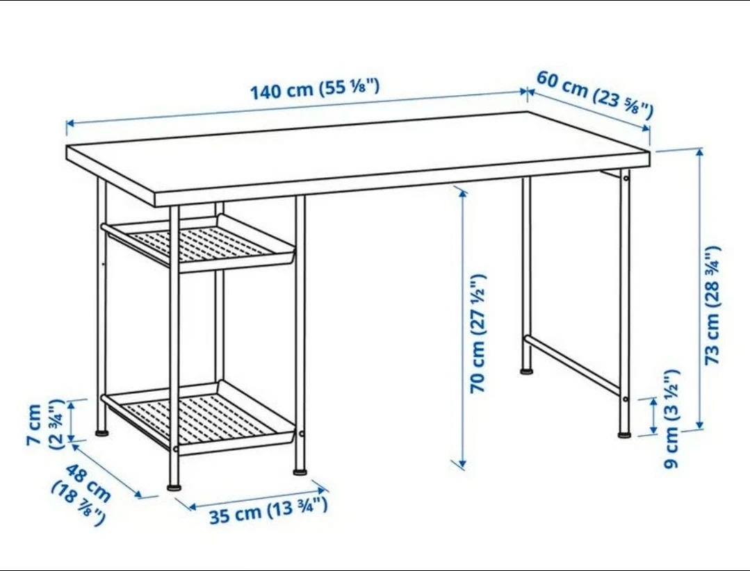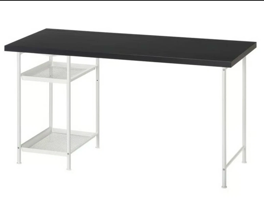 Black IKEA MICKE desk with integrated storage. It's 140cm wide, 60cm deep, and 73cm high. The storage unit has shelves measuring 35cm wide and 48cm deep. It's a sturdy desk for work or study!